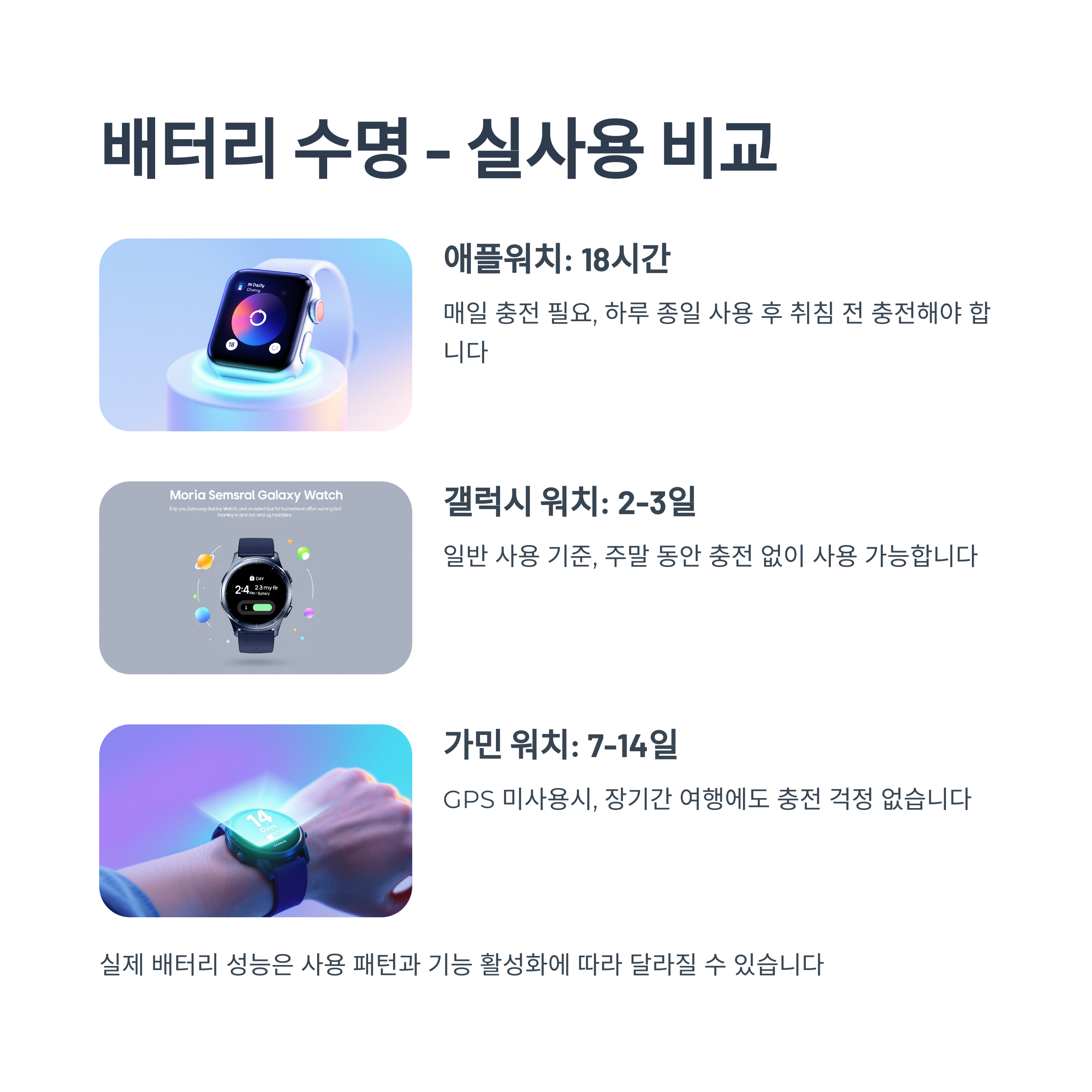 일반적으로 가민의 경우, 한 번 충전으로 짧게는 며칠에서 길게는 몇 주까지 사용할 수 있는 모델들이 많습니다. 특히 태양광 충전 기능을 탑재한 모델들은 아웃도어 활동이 잦은 분들에게 정말 매력적이죠. 반면, 삼성 갤럭시 워치나 애플 워치는 다양한 기능과 밝은 디스플레이를 제공하는 만큼 배터리 소모가 상대적으로 빠른 편입니다. 보통 하루에서 이틀 정도 사용 가능하다고 보시면 되는데, 물론 사용 환경이나 설정에 따라 차이가 있을 수 있습니다.