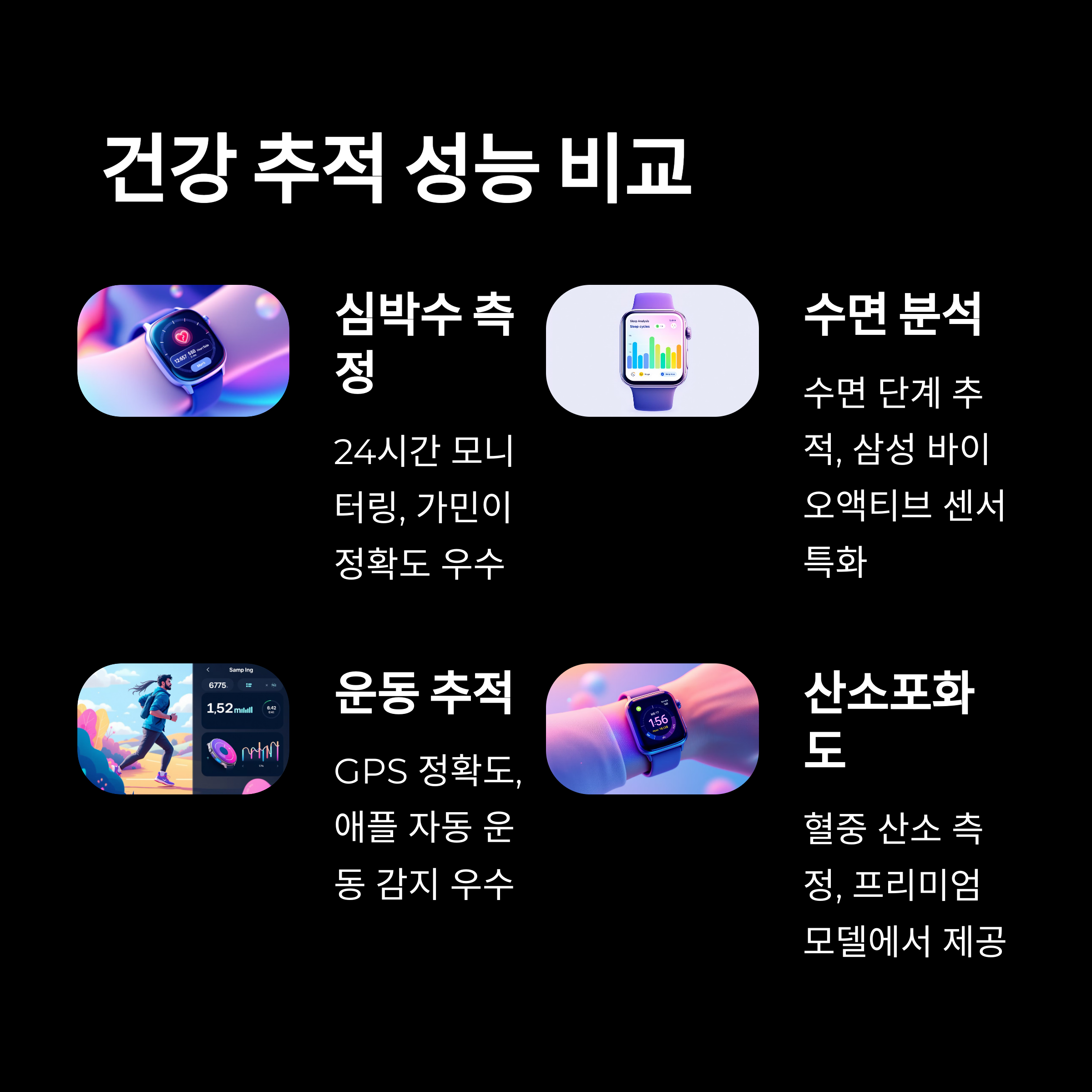 | 삼성 | 중저가 ~ 중고가 (약 20만원 ~ 50만원대) | 안드로이드 사용자, 일상 편의 기능 및 건강 관리 중시 사용자 | 다양한 스마트 기능과 건강 관리 기능을 균형 있게 제공 |
