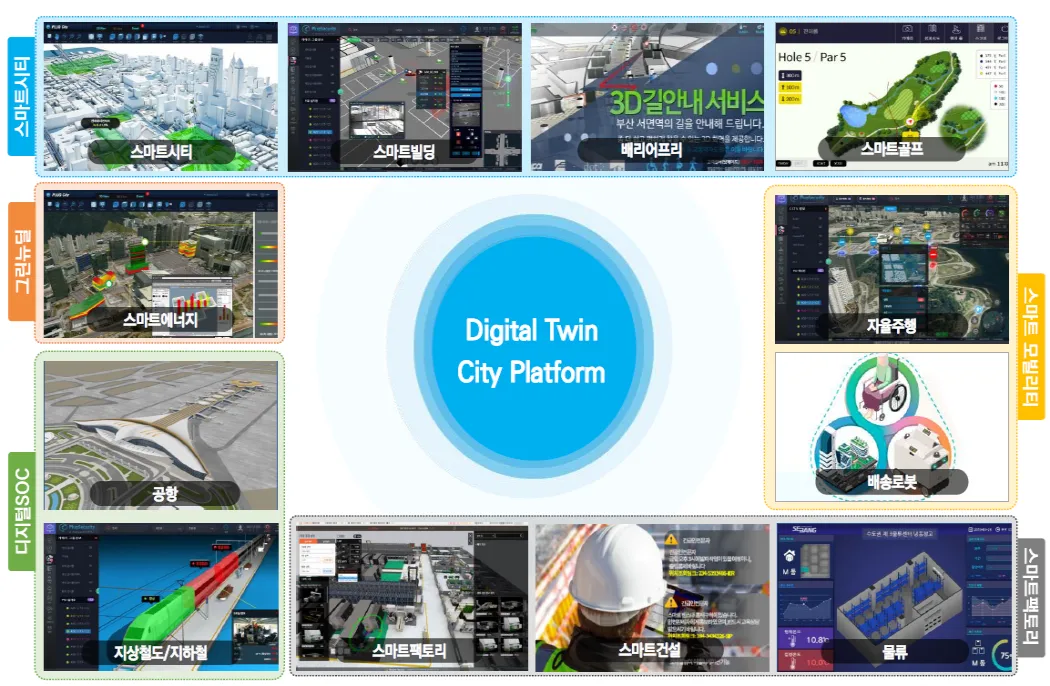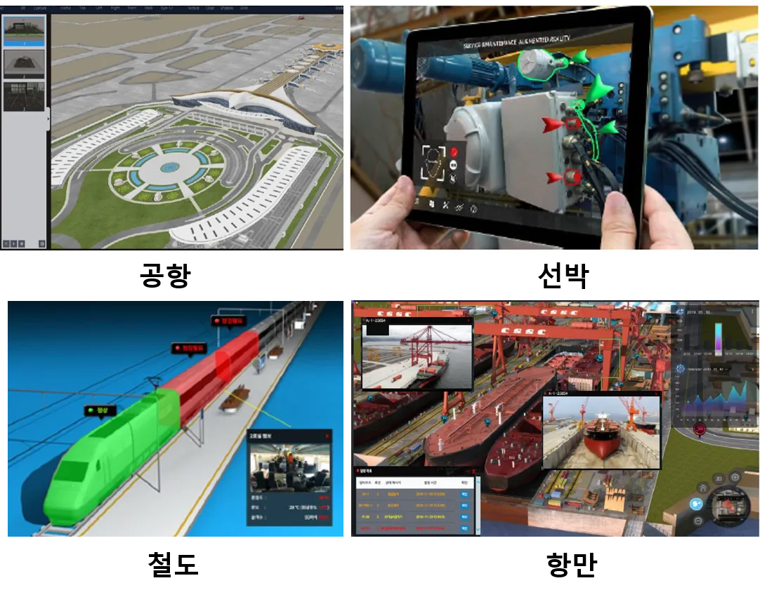 디지털 트윈 기술은 지하철, 철도, 항공, 선박, 항만 등에도 적용이 가능하다. 지하철의 경우, 3D 맵 기반으로 긴급상황 발생시 공간정보를 쉽게 파악할 수 있다. 지하철 장비의 설치 현황 및 상태 정보를 바로 확인할 수 있고, 차량 운행 상황도 실시간으로 모니터링 가능하다. 공항, 항만 및 선박에서도 모든 설비 및 시설빌별로 문제상황을 쉽게 감지할 수 있어, 전체 시스템의 통합 운영 관리가 용이하다.