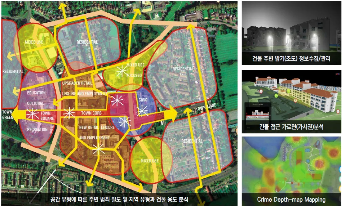 지역의 공간을 분석하여 범죄 유발지역을 추정할 수 있을 것이다. 건물 주변의 밝기 및 건물의 가시권 등을 이용하여 범죄가 일어나기 쉬운 지역을 선정하고 집중 관리하는데 디지털트윈 기술을 이용할 수 있을 것이다.