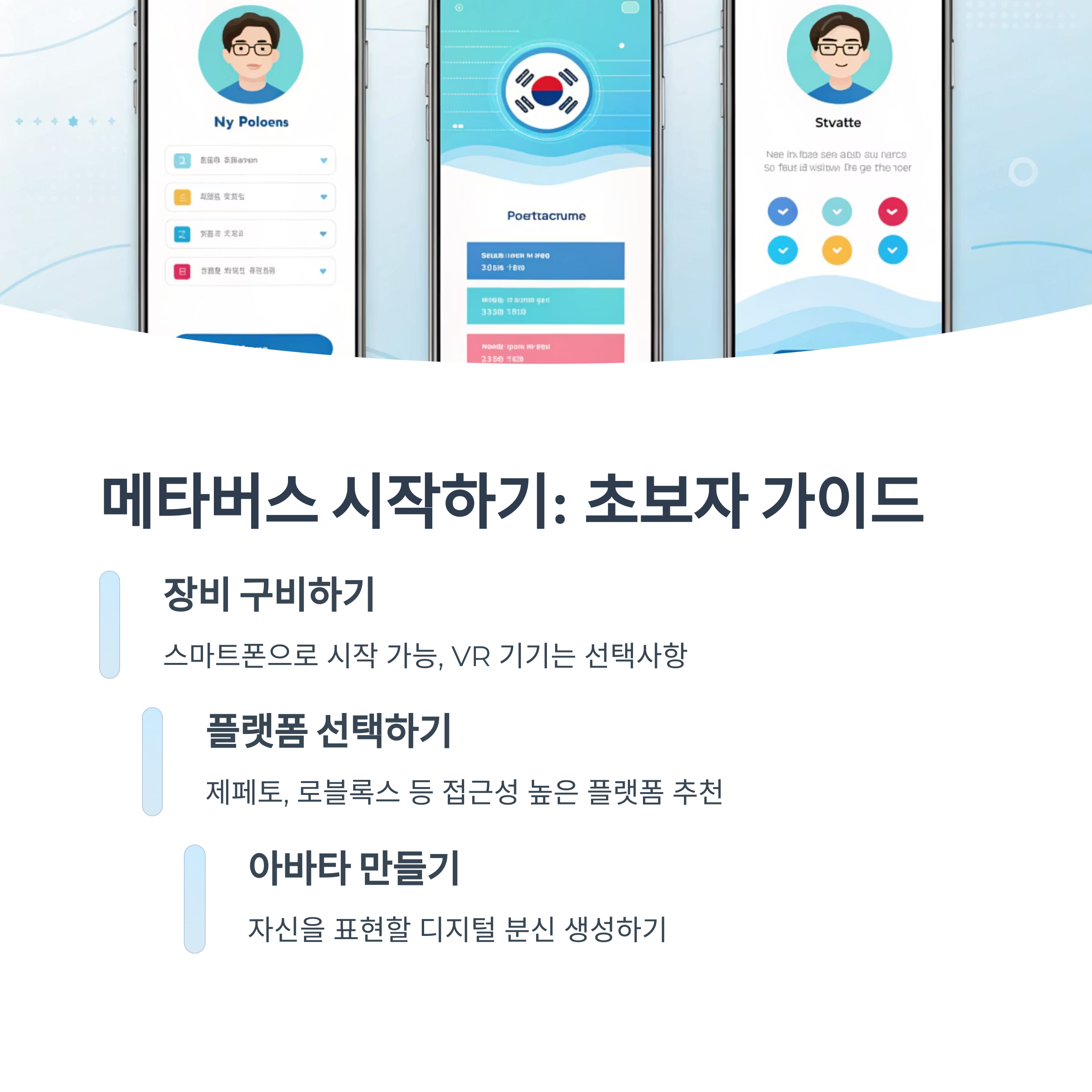 특별한 장비 없이도 스마트폰이나 컴퓨터로 체험할 수 있는 메타버스 플랫폼부터 시작하는 것을 추천해요. 관심 있는 분야에 따라 선택할 수 있는 옵션도 달라지니, 아래 단계별 가이드를 참고해보세요!