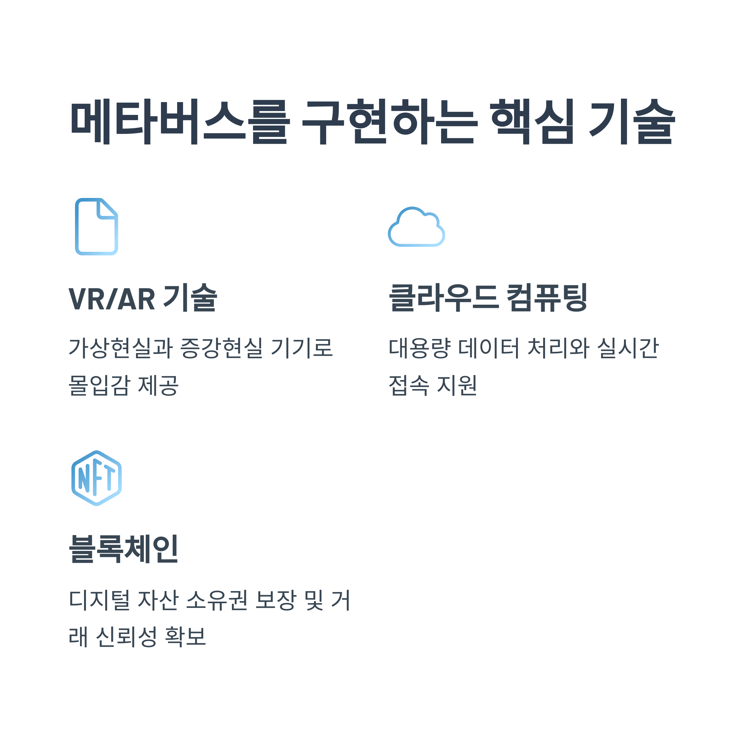 | 블록체인 | 디지털 자산의 소유권 보장, 가상 경제 시스템 구축 | 이더리움, 솔라나, 디센트럴랜드 |