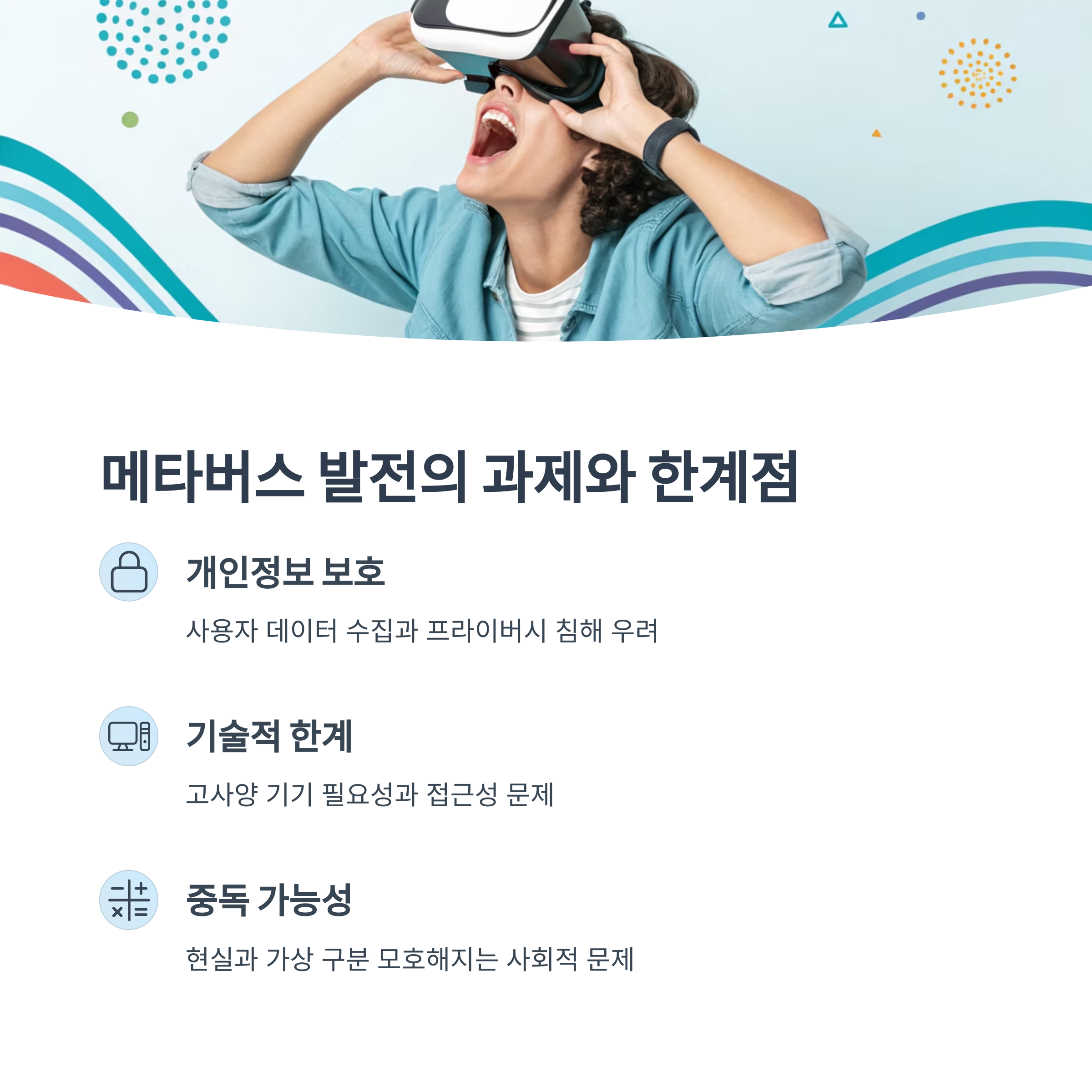 그럼에도 불구하고 기술은 계속 발전하고 있고, 이러한 과제들이 하나씩 해결되면서 메타버스는 더욱 우리 일상에 가까워질 거예요. 현재 메타버스가 직면한 주요 과제들을 살펴볼까요?