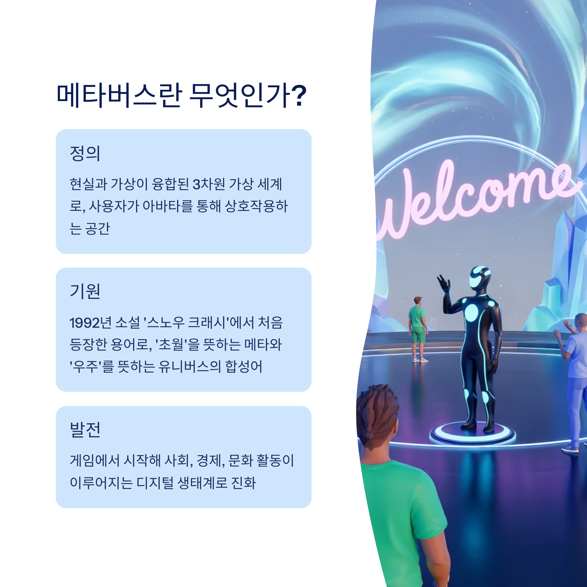 메타버스(Metaverse)란 대체 뭘까요? 사실 이 용어를 처음 들었을 때 저도 굉장히 헷갈렸어요. 뭔가 어려운 기술 용어 같지만, 생각보다 개념은 단순합니다. '메타(Meta)'는 '초월, 가상'을 의미하고, '버스(verse)'는 '우주, 세계'를 뜻하는 'universe'에서 온 말이에요. 쉽게 말하면, 현실을 초월한 가상의 세계라고 볼 수 있죠.