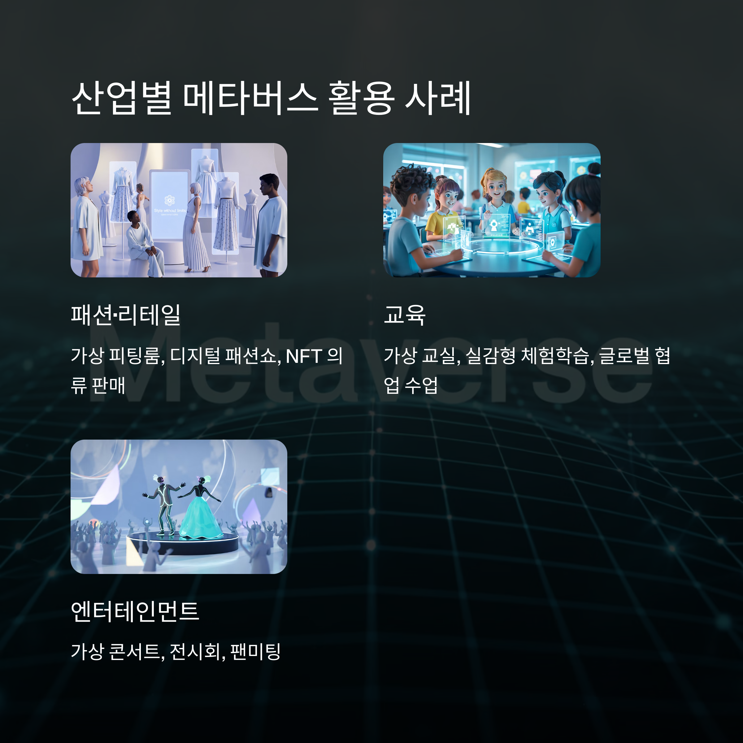 | 2023년 | 약 1,100억 달러 | 게임, 소셜 플랫폼, 가상 콘서트 |