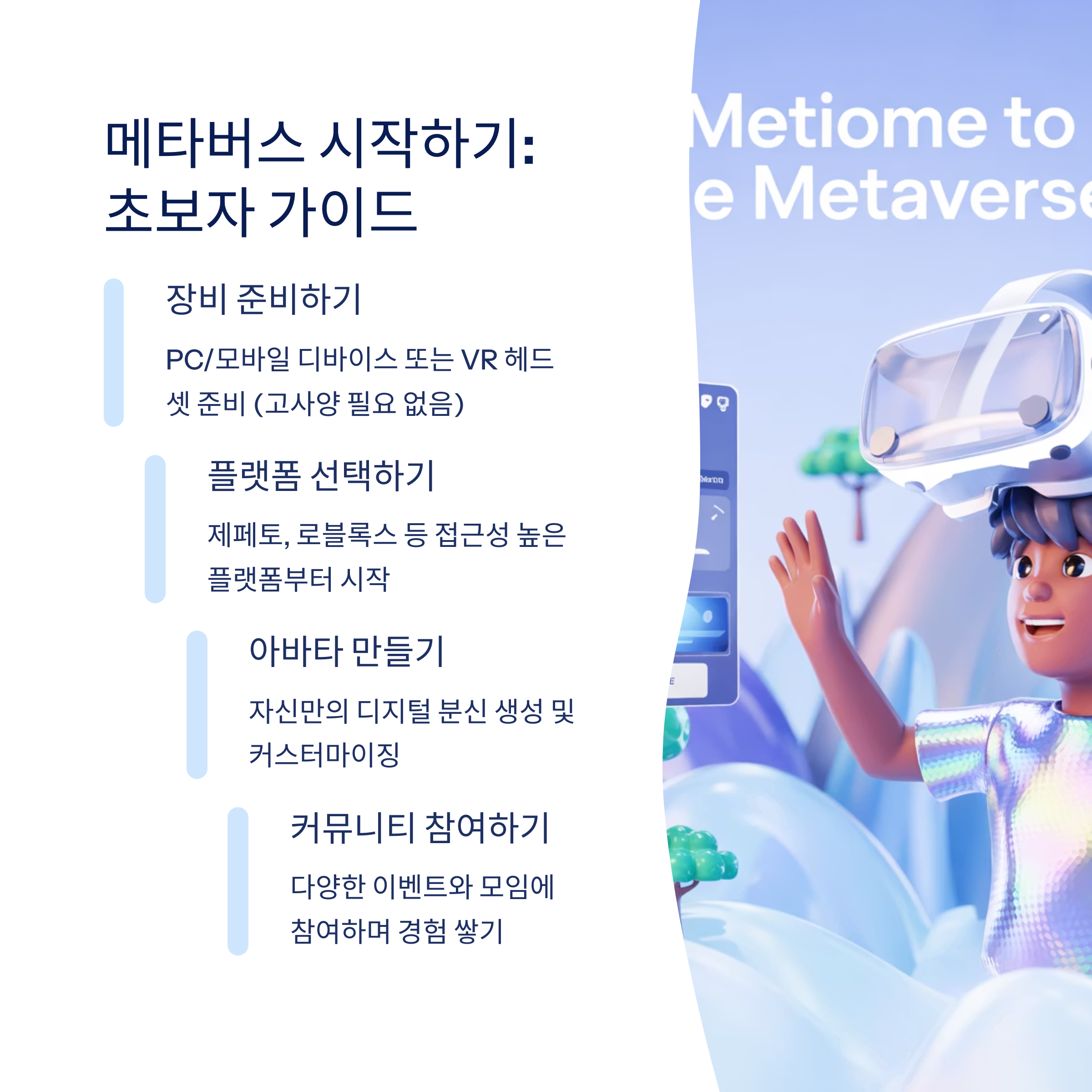 이제 메타버스가 뭔지 알았으니, 직접 경험해보고 싶지 않으신가요? 저도 처음에는 어디서부터 시작해야 할지 막막했어요. 그래서 제가 경험을 바탕으로 초보자를 위한 가이드를 준비했어요!