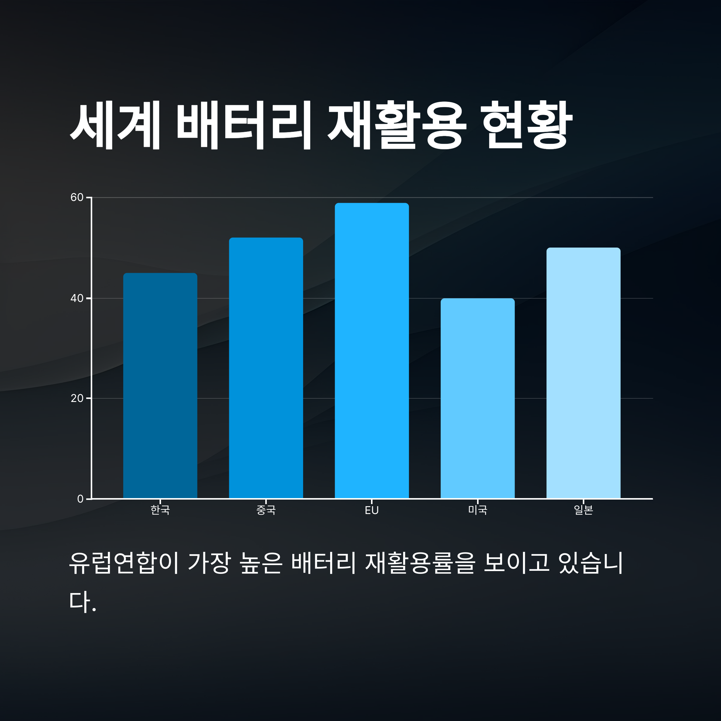 전 세계적으로 전기차 시장이 폭발적으로 성장하면서 폐배터리 문제도 함께 떠오르고 있습니다. 이에 따라 각국 정부와 기업들은 배터리 재활용 산업 육성에 박차를 가하고 있는데요. 유럽연합(EU)은 이미 2030년부터 배터리 재활용 원료 사용을 의무화하는 규제를 발표했고, 미국 역시 인플레이션 감축법(IRA)을 통해 자국 내 배터리 공급망 강화 및 재활용 산업을 적극 지원하고 있습니다. 중국은 세계 최대 전기차 시장인 만큼 폐배터리 재활용 기술 개발과 인프라 구축에 엄청난 투자를 하고 있고요. 마치 골드러시처럼 새로운 시장을 선점하기 위한 경쟁이 치열하게 벌어지고 있는 셈입니다. 우리나라 역시 배터리 제조 강국으로서 이 흐름에 뒤처지지 않기 위해 다양한 정책 지원과 기술 개발에 힘쓰고 있습니다. 특히, 사용 후 배터리를 에너지 저장 장치(ESS)로 재사용하거나, 핵심 소재를 추출해 다시 배터리 제조에 활용하는 방식이 활발하게 연구되고 있죠. 앞으로 배터리 재활용 시장은 환경 규제 강화, 원자재 가격 상승, 공급망 안정화 요구 등에 힘입어 더욱 가파르게 성장할 것으로 예상됩니다.