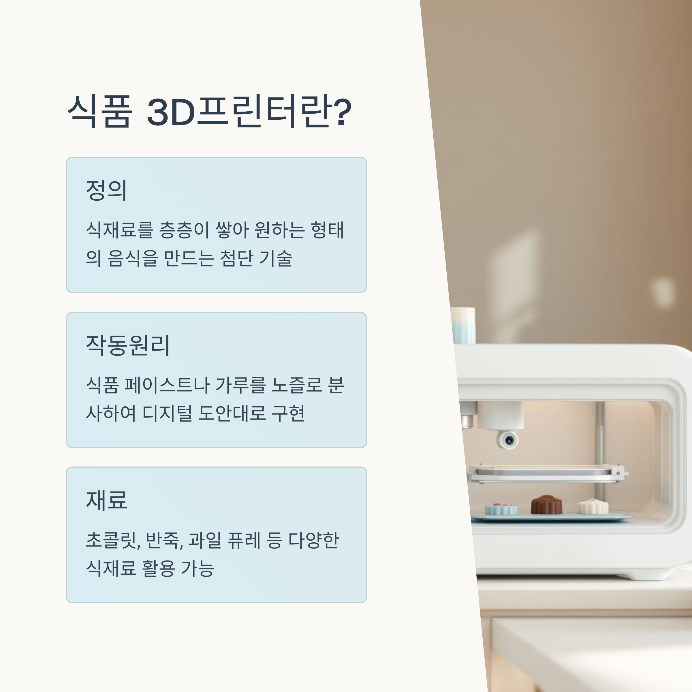 '식품 3D프린터'라는 단어를 들으면 어떤 이미지가 떠오르시나요? 혹시 공상과학 영화에나 나올 법한, 버튼 하나만 누르면 뚝딱하고 스테이크가 완성되는 그런 마법 같은 기계를 상상하셨나요? 네, 뭐 아주 틀린 말은 아닙니다! 식품 3D프린터는 기본적으로 우리가 흔히 아는 3D프린터와 원리가 같아요. 디지털 디자인 파일을 바탕으로 재료를 층층이 쌓아 올려 입체적인 결과물을 만들어내는 거죠. 다만, 플라스틱이나 금속 대신 초콜릿, 반죽, 퓨레 같은 '먹을 수 있는 재료'를 사용한다는 점이 핵심적인 차이점입니다. 한마디로, 우리가 원하는 모양과 질감, 심지어 영양까지 고려한 맞춤형 음식을 '출력'해내는 혁신적인 푸드테크 기술이라고 할 수 있겠습니다. 처음 이 개념을 접했을 때, 저는 마치 요리계의 연금술사 같다는 생각을 했어요. 단순한 식재료가 예술 작품처럼 변신하는 모습이 정말 신기했거든요.