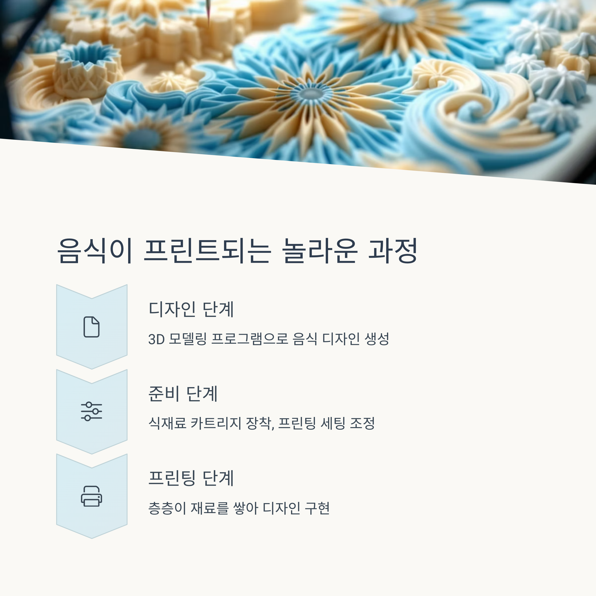 | 4. 프린팅 실행 | 프린터가 3D 모델 데이터에 따라 식재료를 한 층씩 쌓아 올리며 음식을 만듭니다. | 압출 방식, 바인더 제팅 방식 등 다양한 프린팅 방식 존재 |