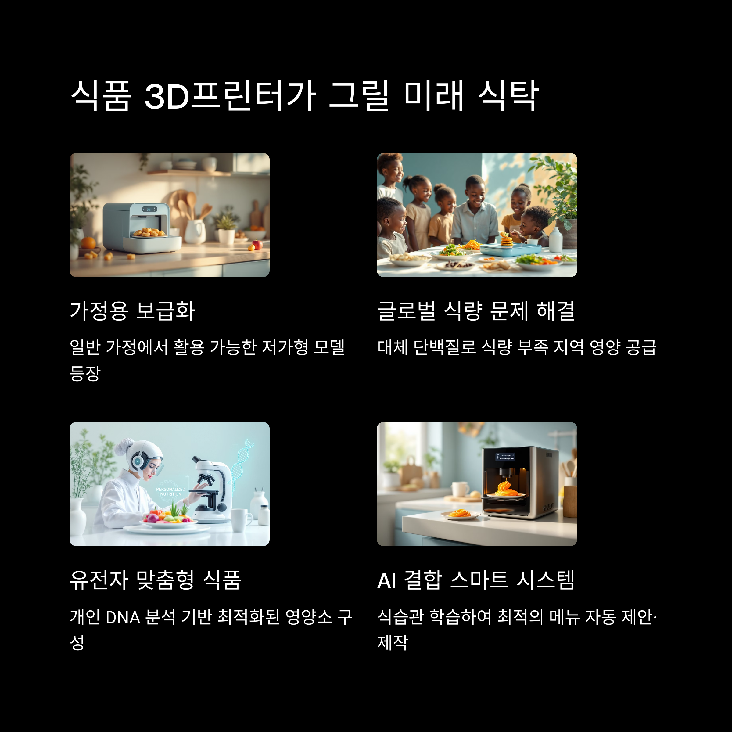 | 3. 지속 가능한 '미래 식품'의 대중화 | 곤충 단백질, 배양육, 해조류 등 지속 가능한 미래 식재료를 활용하여 맛과 영양을 갖춘 다양한 음식을 프린트합니다. | 환경 보호, 식량 안보 문제 해결 기여, 새로운 미식 경험 제공 |