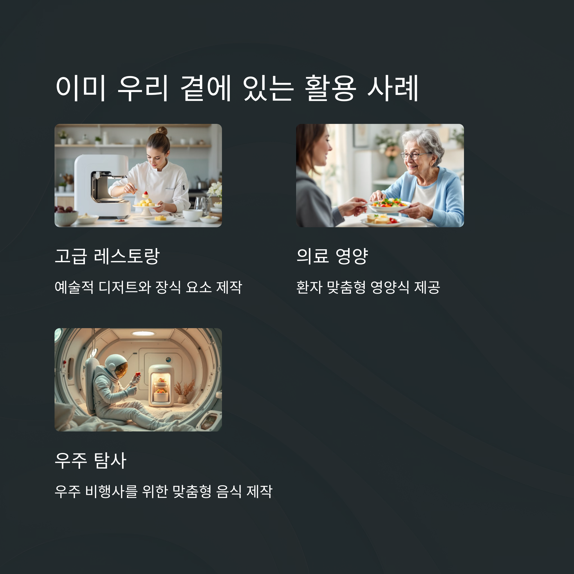 '식품 3D프린터'라고 하면 아직은 먼 미래의 기술처럼 느껴지실 수도 있겠지만, 놀랍게도 이미 다양한 분야에서 활용되며 우리 생활 가까이 다가오고 있습니다. 저도 이번에 조사하면서 "어? 이런 곳에서도 쓰인다고?" 하고 놀랐던 사례들이 꽤 많았는데요. 몇 가지 흥미로운 예시들을 소개해 드릴게요. 아마 생각보다 더 가까운 곳에서 식품 3D프린팅 기술이 활약하고 있다는 사실에 놀라실지도 모릅니다!