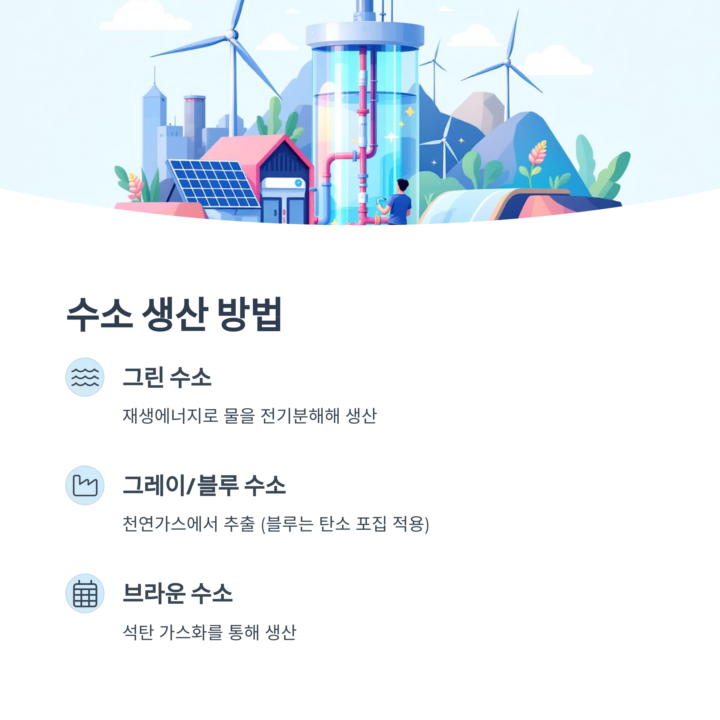 수소를 에너지원으로 사용하려면 먼저 수소를 만들어야겠죠? 그런데 이 수소를 만드는 방법이 생각보다 정말 다양하더라고요. 처음엔 다 똑같은 수소인 줄 알았는데, 생산 방식에 따라 마치 커피 원두의 등급처럼 '색깔'로 구분하기도 한다는 걸 알고 좀 놀랐어요. 현재 가장 많이 사용되고, 경제적인 방식은 천연가스(주성분 메탄)를 고온의 수증기와 반응시켜 수소를 얻는 '그레이 수소' 방식이에요. 하지만 이 과정에서 이산화탄소(CO₂)가 함께 배출된다는 단점이 있죠. 그래서 최근에는 그레이 수소 생산 과정에서 나오는 이산화탄소를 포집·활용·저장하는 기술(CCUS)을 적용한 '블루 수소'가 대안으로 떠오르고 있어요. 궁극적으로는 태양광이나 풍력 같은 재생에너지를 이용해 물을 전기분해해서 수소를 생산하는 '그린 수소'가 진정한 친환경 수소로 각광받고 있답니다. 물론 아직 그린 수소는 생산 단가가 다른 수소에 비해 높다는 현실적인 숙제가 남아있긴 해요. 이 외에도 석유화학 공정이나 제철 공정에서 부수적으로 나오는 '부생 수소'도 활용되고 있습니다. 각 생산 방식별 특징을 한번 표로 정리해봤어요.