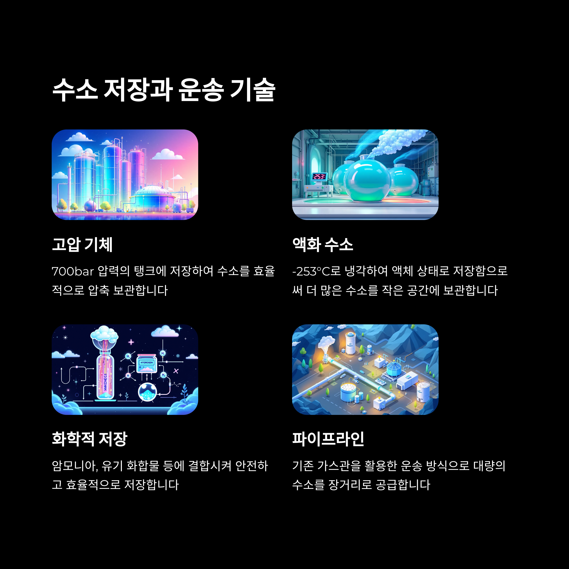 - 고압 기체 저장: 수소를 압축해서 특수 제작된 탱크에 저장하는 방식이에요. 수소 충전소나 수소 자동차 연료탱크에 주로 사용되죠.