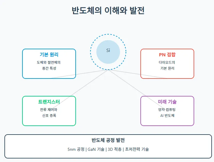 반도체는 전자의 이동을 제어하는 방식으로 전류의 흐름을 조절합니다. P형과 N형 반도체를 결합하여 전류를 한 방향으로 흐르게 하는 PN 접합이 대표적인 원리입니다.