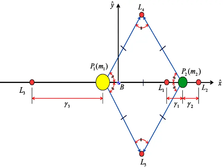 세 개의 물체가 서로의 중력 균형을 이루는 특수한 지점을 의미한다. 5개의 라그랑주 점이 존재하며, 이주 L1, L2, L3의 위치는 인공위성 궤도 설계 등에 활용되어 중요한 지점이다. 1775년 조제르 루이 라그랑주에 의해 확인되었다.