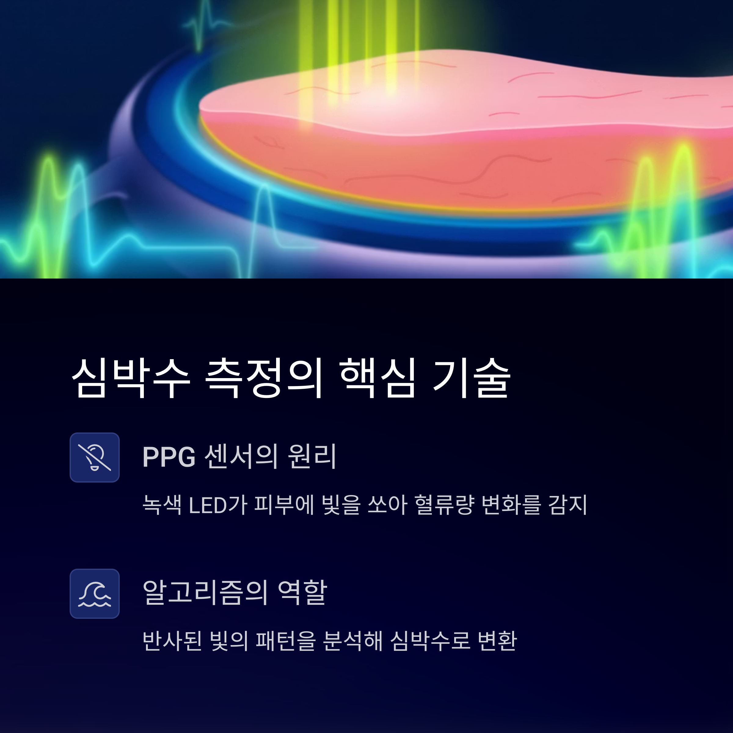 | PPG 센서의 한계 | 외부 강한 빛의 간섭에 취약할 수 있음, 사용자의 피부톤, 털, 문신 등에 따라 정확도 영향 받을 수 있음, 격렬한 움직임 발생 시 노이즈 증가 |