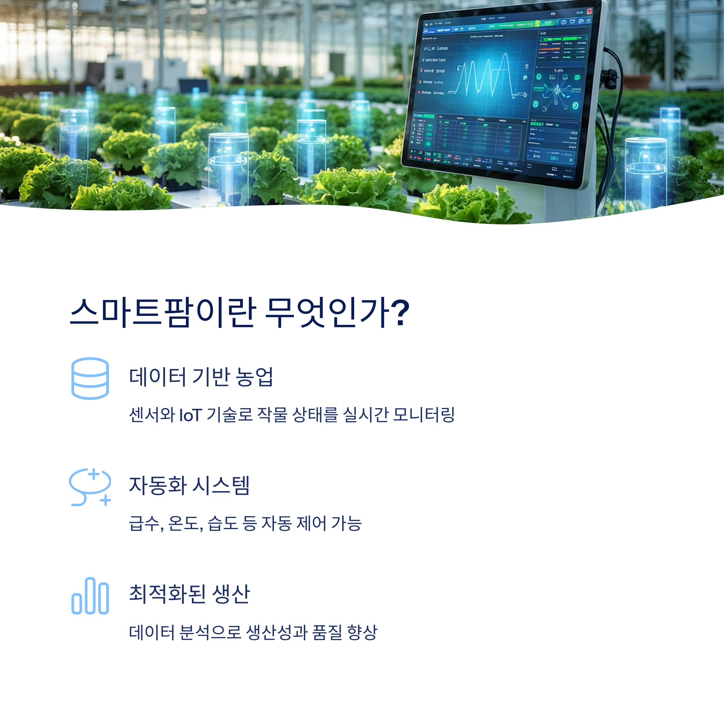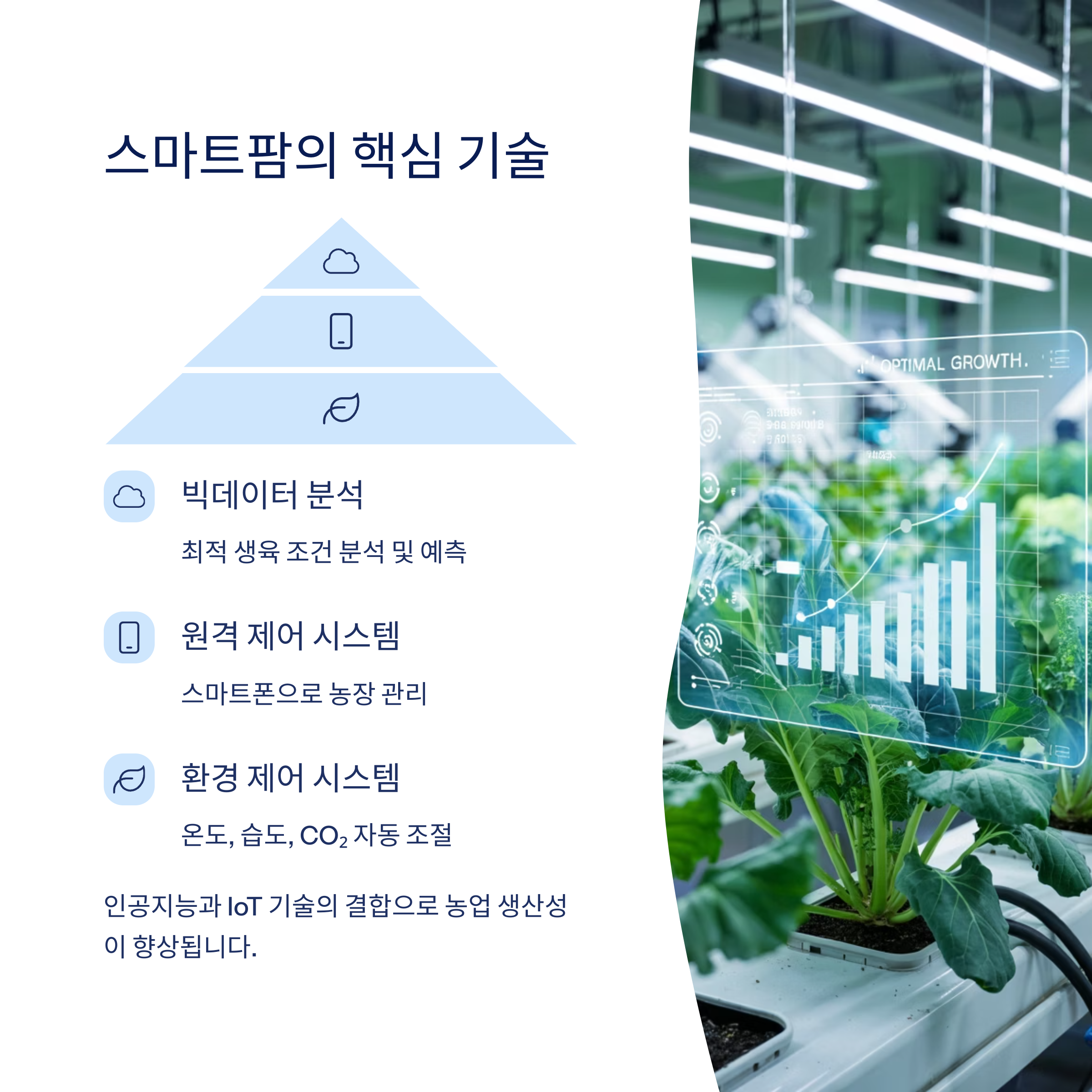 스마트팜(Smart Farm)이라고 하면 뭔가 거창하고 복잡한 개념처럼 들리지만, 핵심은 의외로 간단해요. 그냥 첨단 ICT(정보통신기술)를 농업에 접목한 거예요. 쉽게 말하면, 사람이 직접 하던 농사일을 센서, 인공지능, 로봇이 대신하거나 도와주는 시스템이죠. 농작물 재배부터 수확, 유통까지 전 과정을 데이터로 관리하고 최적화하는 거랍니다.