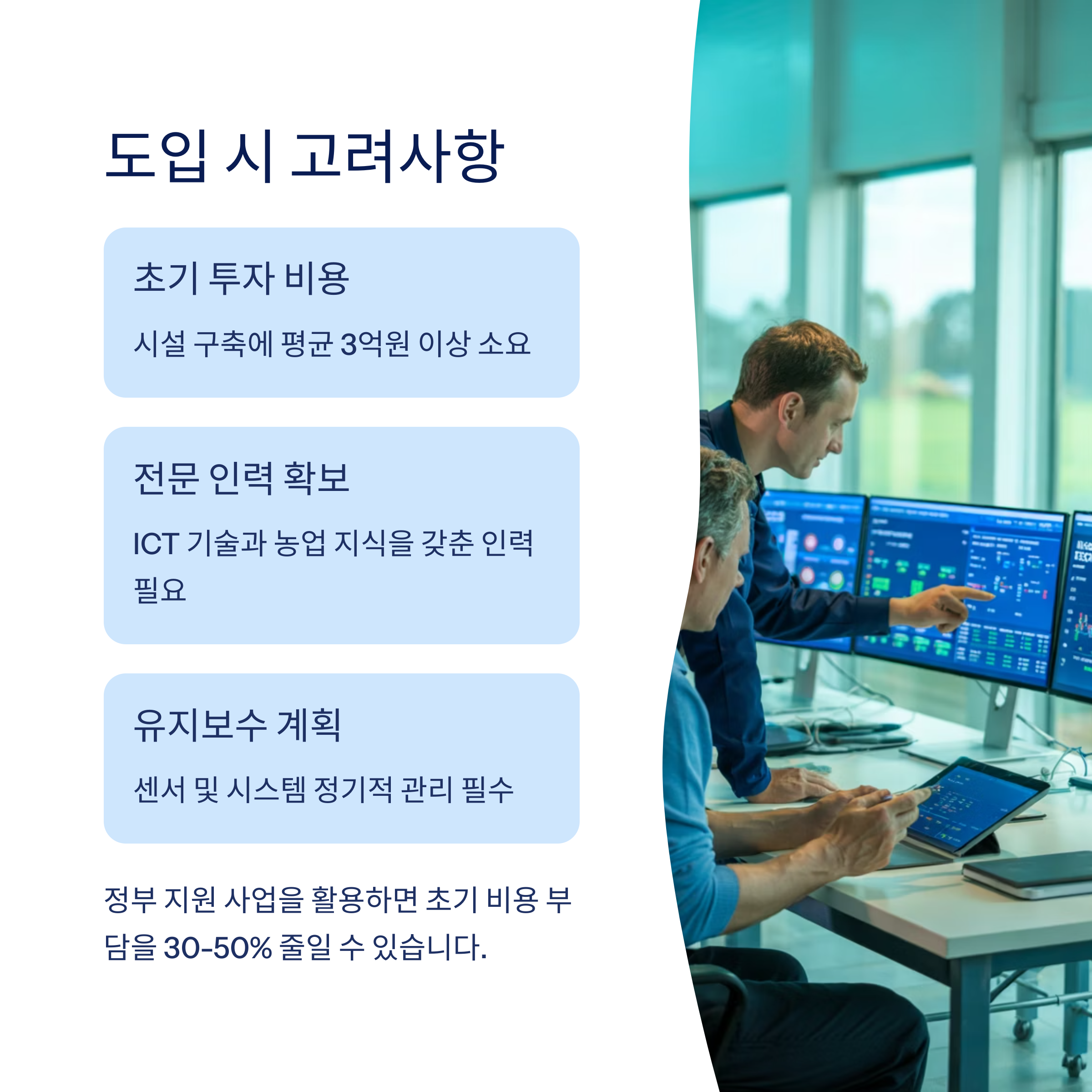| 초기 투자 비용 | 시설 구축, 장비 도입, 시스템 설치 등에 상당한 비용 소요 (1ha 기준 10~15억원) | 정부 지원 사업 활용, 단계적 도입, 협동조합 형태의 공동 투자 |