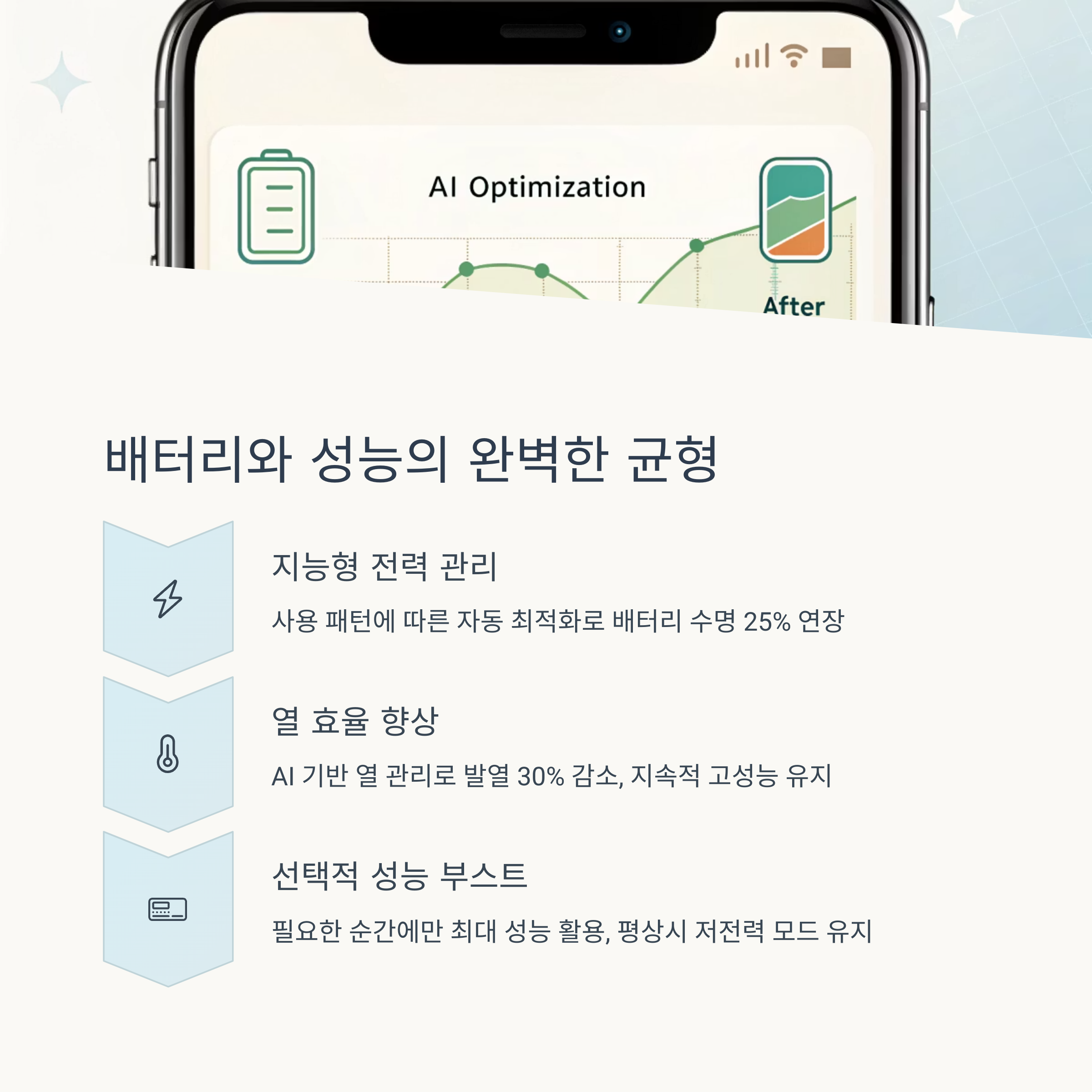 스마트폰을 사용하면서 가장 큰 고민거리 중 하나가 바로 배터리 수명이죠. 아무리 성능이 좋아도 배터리가 금방 닳으면 실용성이 떨어지니까요. 여기서 AI 칩의 또 다른 중요한 역할이 등장해요. 바로 성능과 배터리 효율성 사이의 완벽한 균형을 맞추는 거예요.