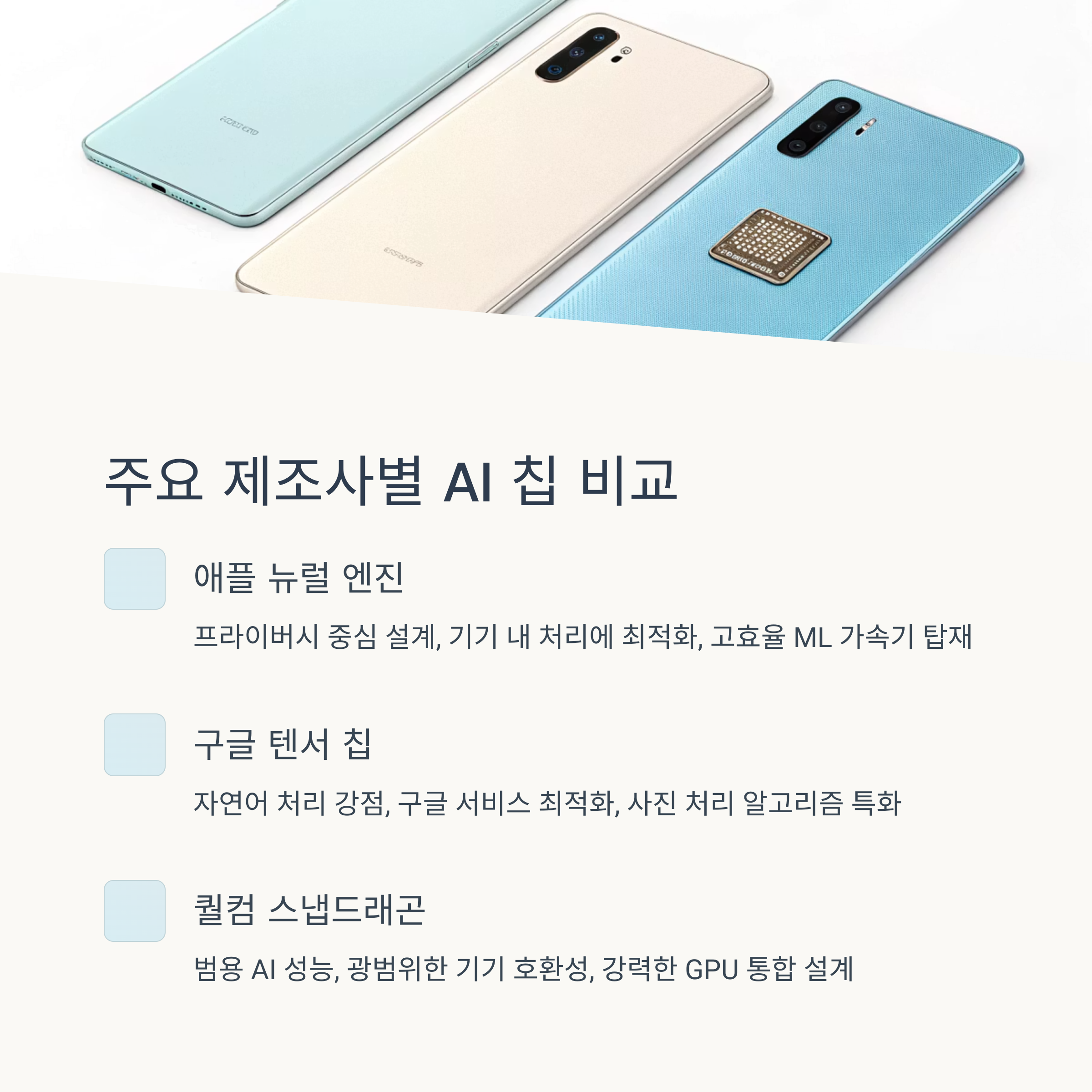 | 구글 | Tensor G3 | 자연어 처리와 사진 보정에 특화, 구글 서비스 통합 | 약 20 |