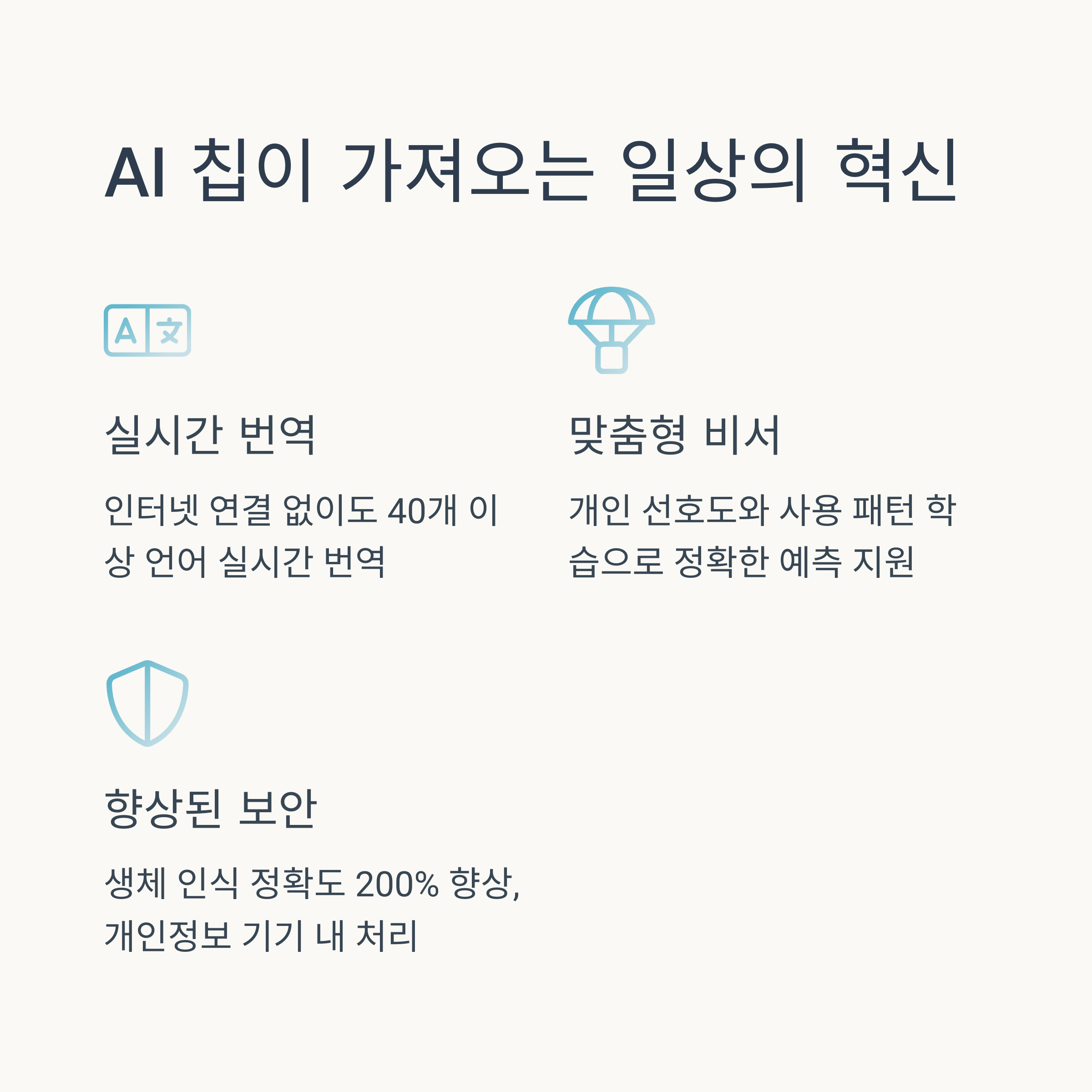 - 실시간 번역과 자막 생성 - 외국 영상을 볼 때 자동으로 자막이 생성되고, 실시간 통화 중에도 번역이 가능해요. 이전에는 상상도 못했던 기능이죠.