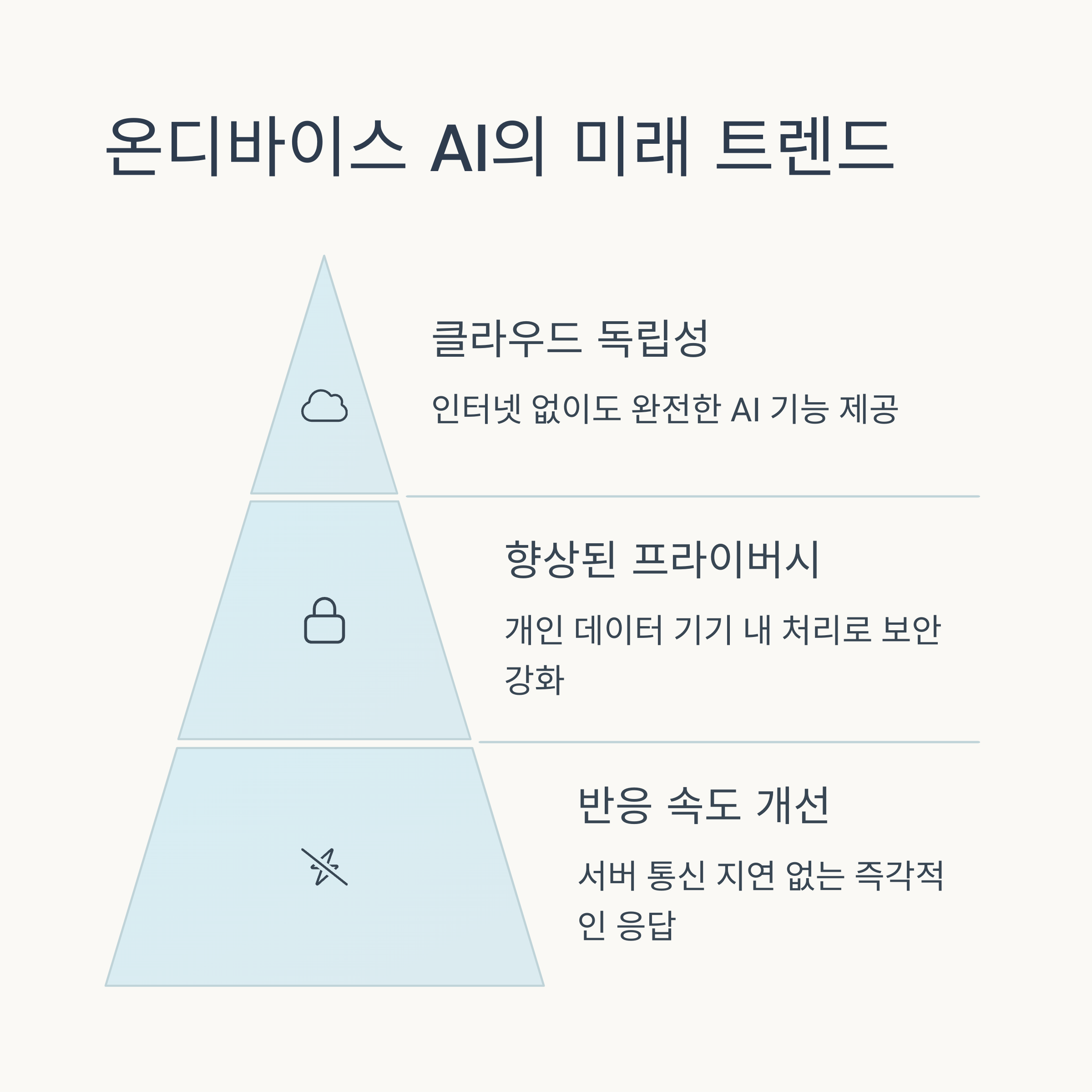 가장 확실한 트렌드는 '온디바이스 AI'의 강화예요. 지금까지는 복잡한 AI 작업은 클라우드 서버에 의존했지만, 앞으로는 더 많은 AI 처리가 기기 내에서 직접 이루어질 거예요. 이미 일부 최신 폰에서는 ChatGPT 같은 대형 언어 모델의 경량 버전이 오프라인으로 실행되고 있고, 앞으로 2-3년 내에는 훨씬 더 강력한 AI 모델이 스마트폰에서 직접 구동될 거라고 해요.