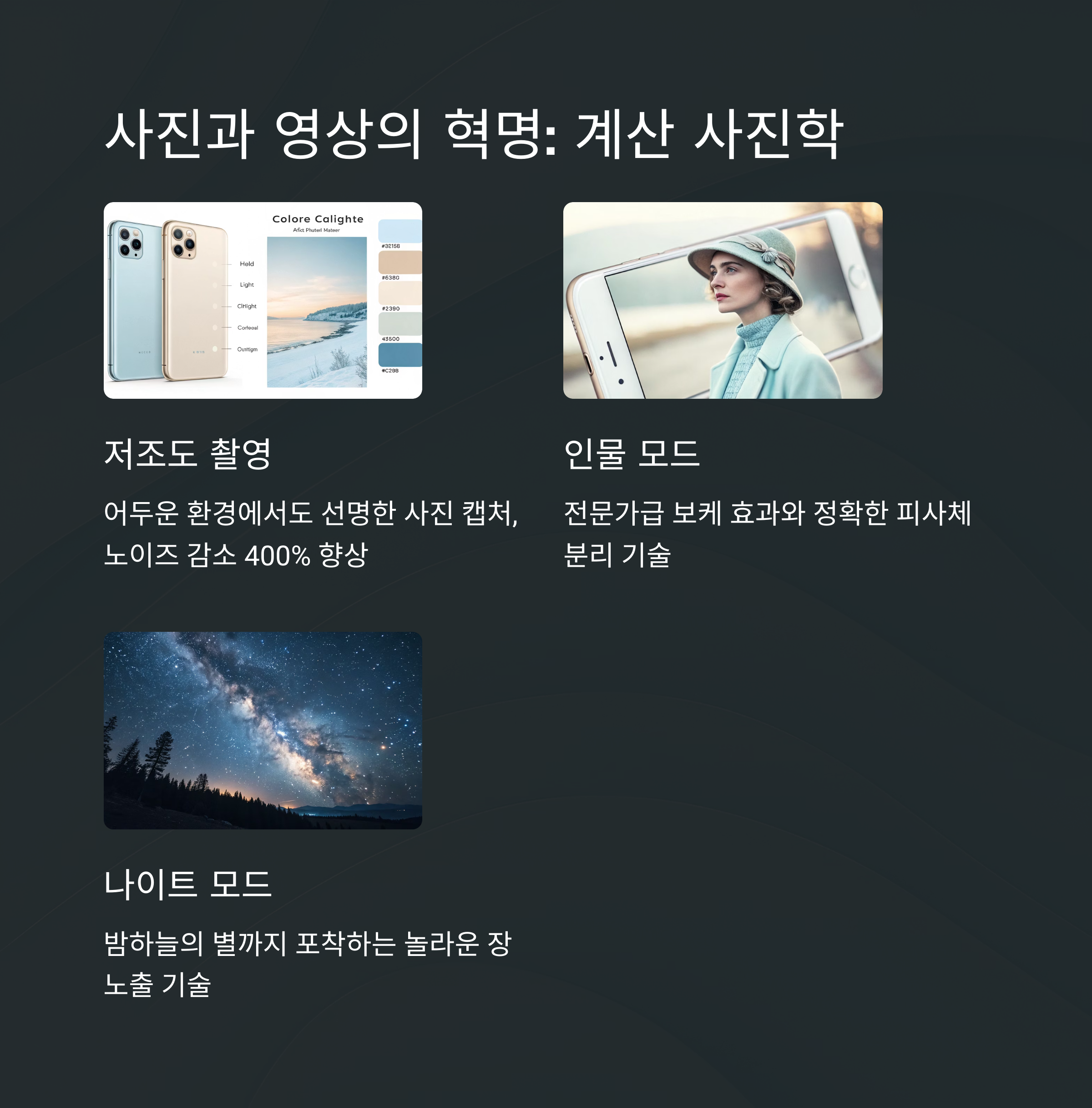 계산 사진학은 간단히 말해서 하드웨어의 한계를 소프트웨어로 극복하는 기술이에요. 작은 스마트폰 센서로는 물리적으로 담아낼 수 없는 정보를 AI가 계산을 통해 만들어내는 거죠. 최근에 친구들과 밤에 모임을 가졌을 때, 예전 같으면 어두워서 제대로 된 사진을 못 찍었을 텐데... 요즘 폰은 밤에도 낮처럼 밝고 선명한 사진을 찍더라고요. 이게 다 AI 칩이 여러 장의 사진을 합성하고 노이즈를 제거하는 복잡한 계산을 실시간으로 처리해주기 때문이에요.