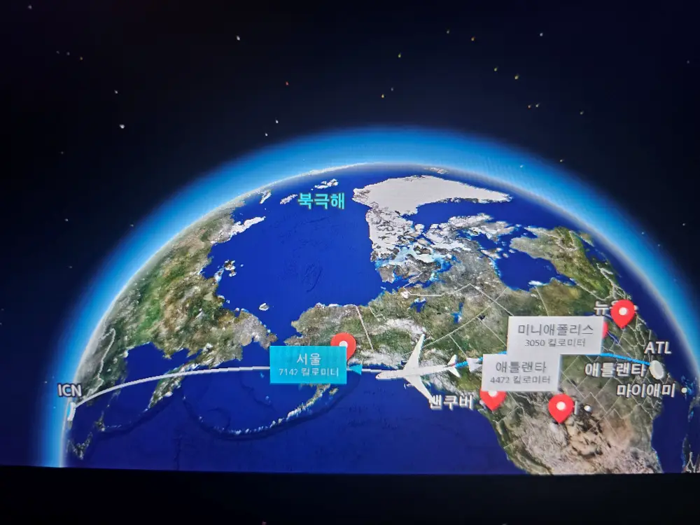 비행기 안에서 위의 촬영 팁을 이용하여 오로라 촬영이 가능하다. 대한항공에서 운행하는 애틀란타애틀랜타 출발, 인천공항 도착하는 비행기를 탔을 때이다. 이 경우, 아래와 같이 북극에 가까운 곳을 지나서 비행기가 운행되기 때문에 오로라 관측이 가능하였다. 비행기 좌석은 애틀랜타에서 인천으로 오는 경우에 오른쪽으로 앉아야 한다. 그래야 북극 방향이 오른쪽에서 보이게 된다. 아래의 그림처럼 서울에서 약 7000km 떨어진 곳에서 오로라를 관측할 수 있었다.