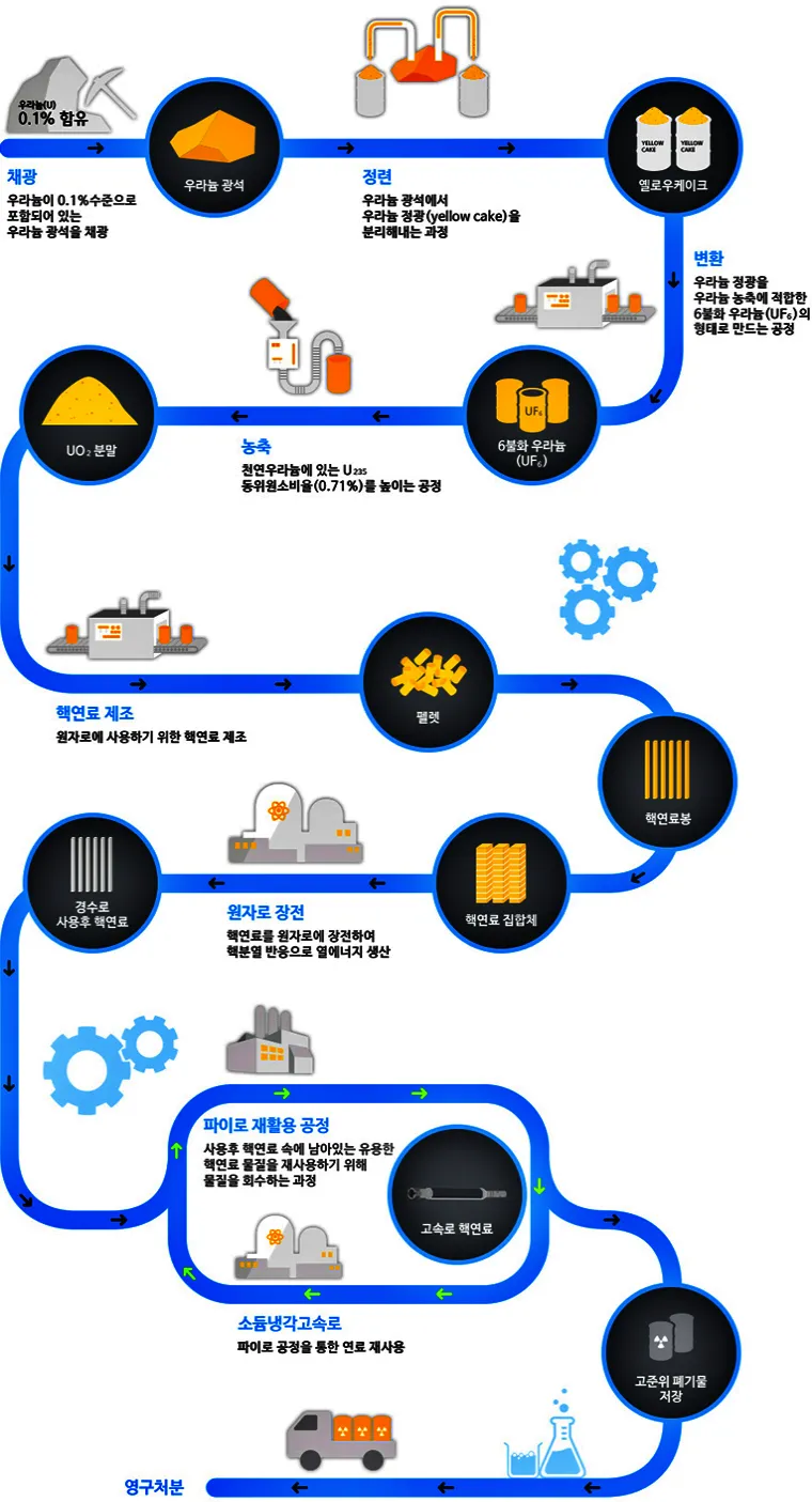 우라늄 광석 채굴 → 정련 → 농축 → 핵연료 제조 → 원자로 장전 → 핵분열 반응 → 사용 후 핵연료 → 재활용 또는 영구 처분