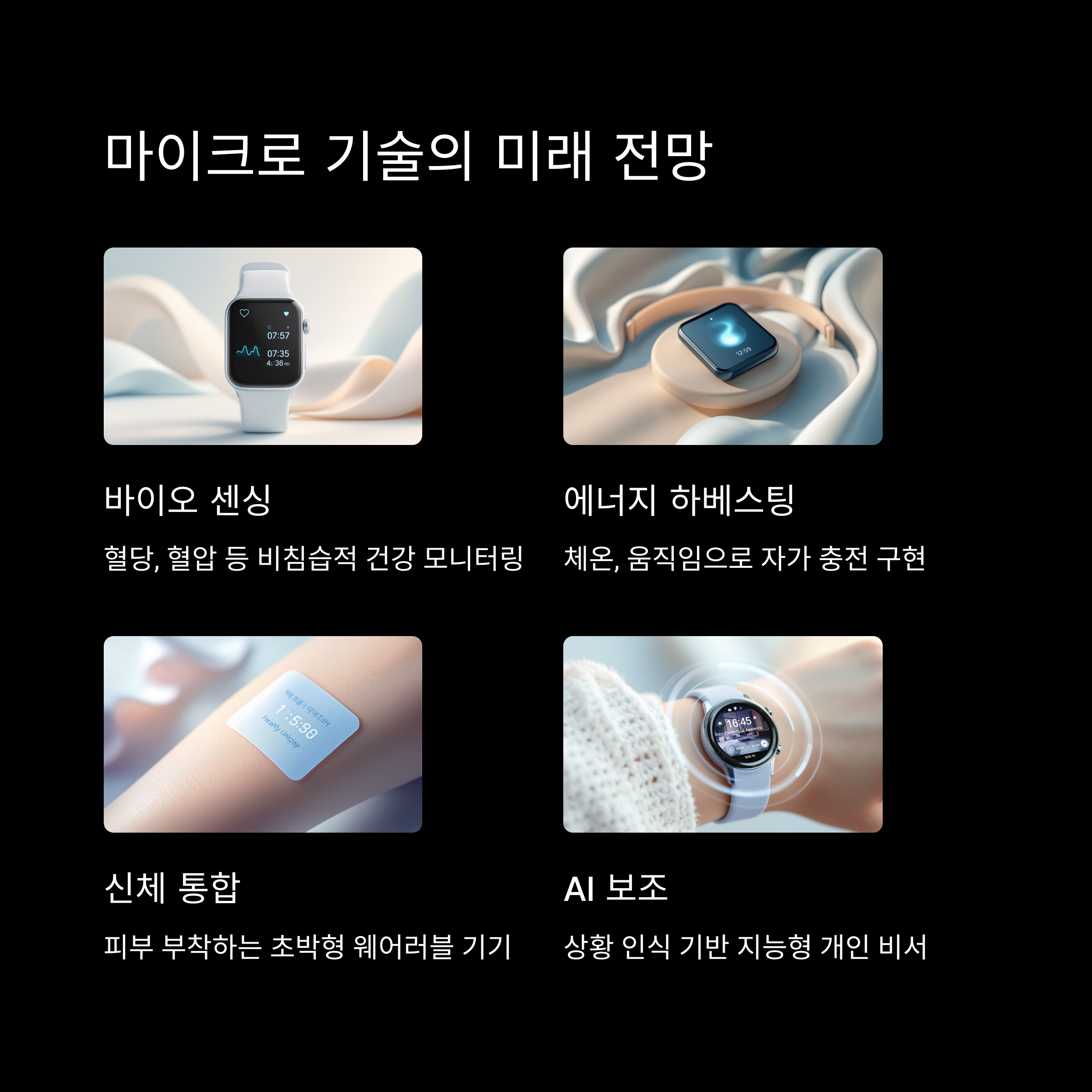 지금까지 스마트워치 속에 숨겨진 다양한 마이크로 기술들을 살펴보았습니다. 정말 작은 기기 안에 이렇게 많은 첨단 기술이 집약되어 있다는 사실이 새삼 놀랍게 느껴지는데요. AP칩부터 센서, 디스플레이, 통신 모듈, 배터리 기술에 이르기까지 모든 분야에서 마이크로 기술은 끊임없이 발전하며 스마트워치의 성능을 끌어올리고 있습니다. 그렇다면 미래의 스마트워치는 어떤 모습일까요? 현재의 기술 발전 추세를 바탕으로 몇 가지 흥미로운 가능성들을 상상해 볼 수 있을 것 같습니다. 제가 특히 기대하는 미래 스마트워치의 마이크로 기술들은 다음과 같습니다.