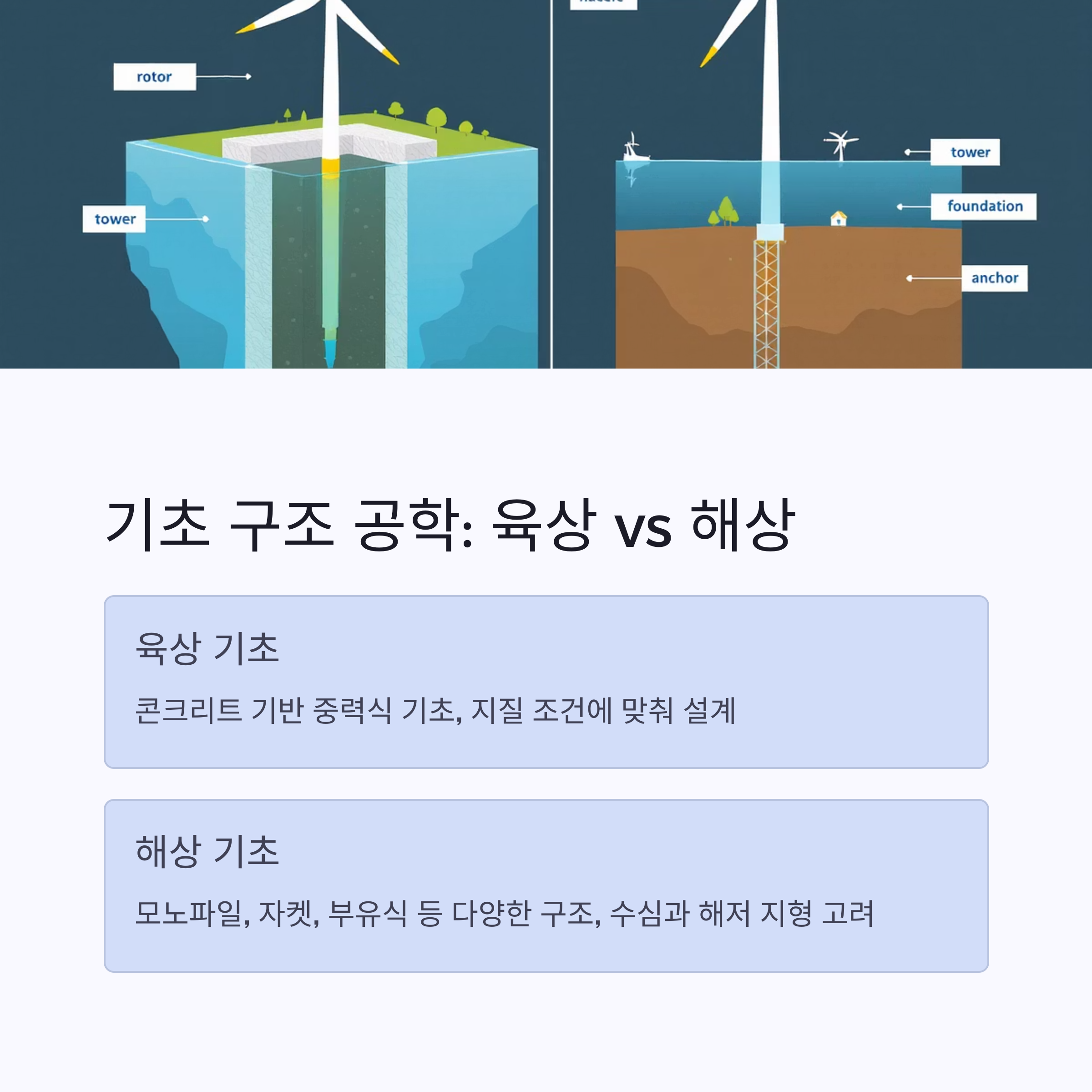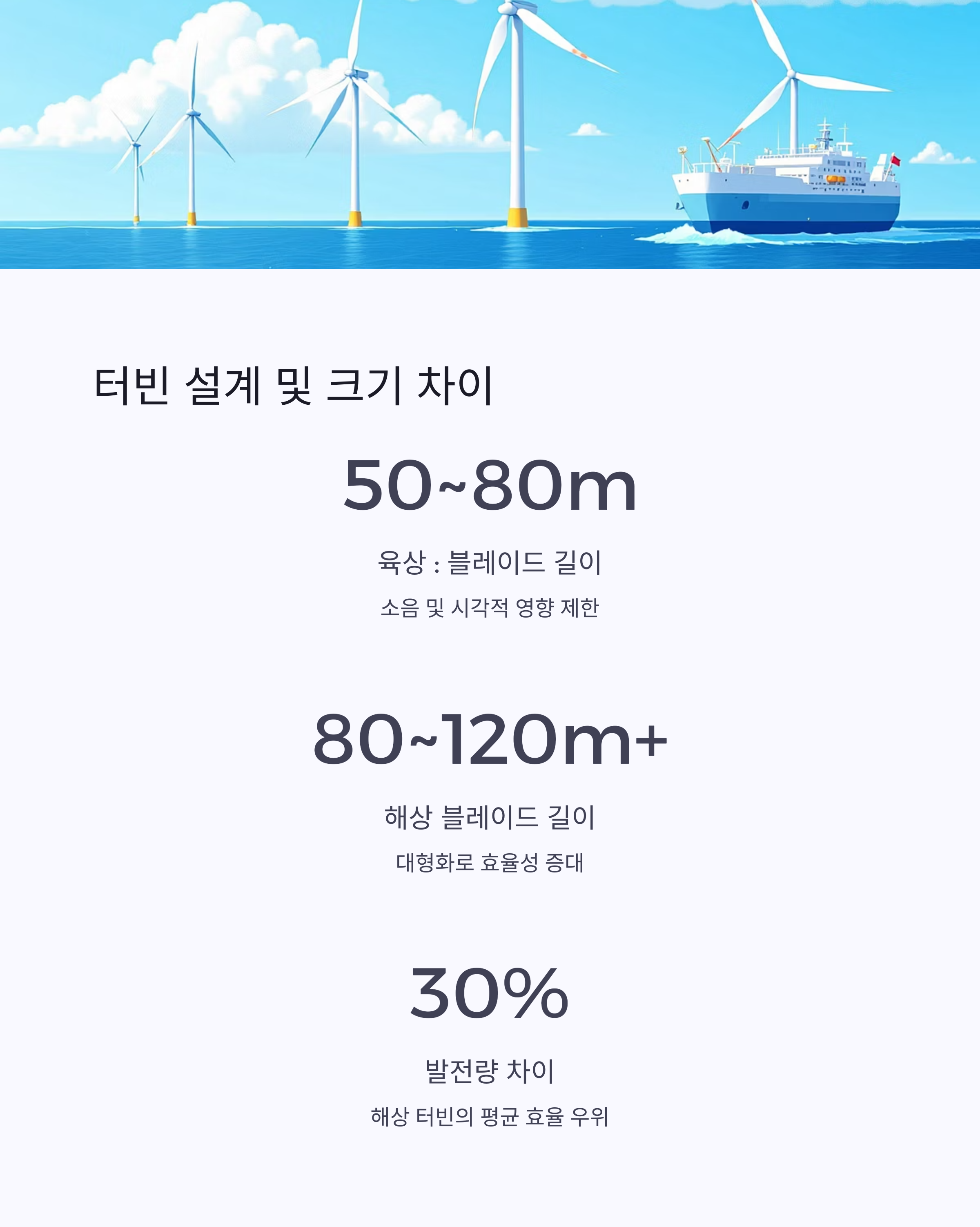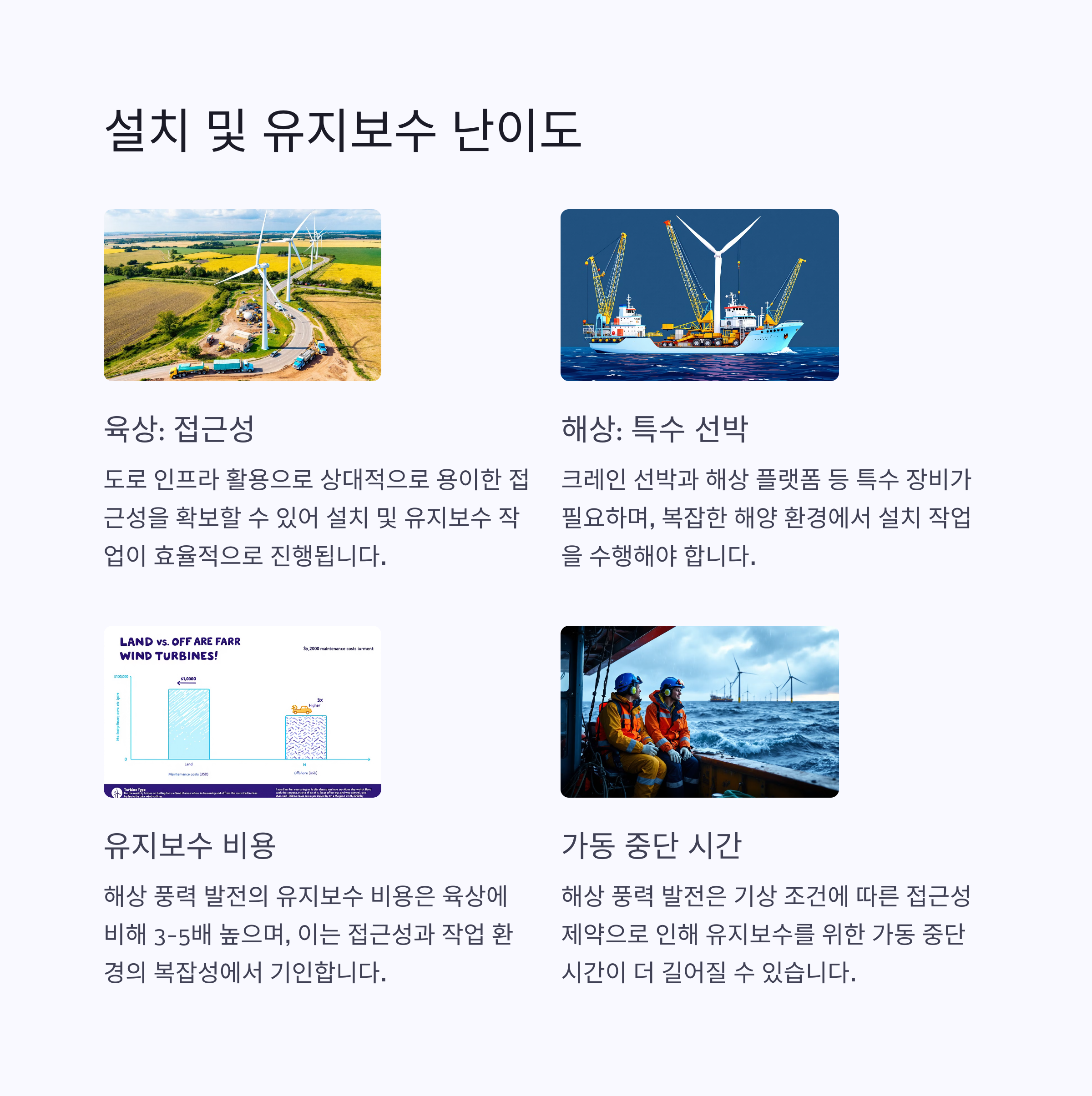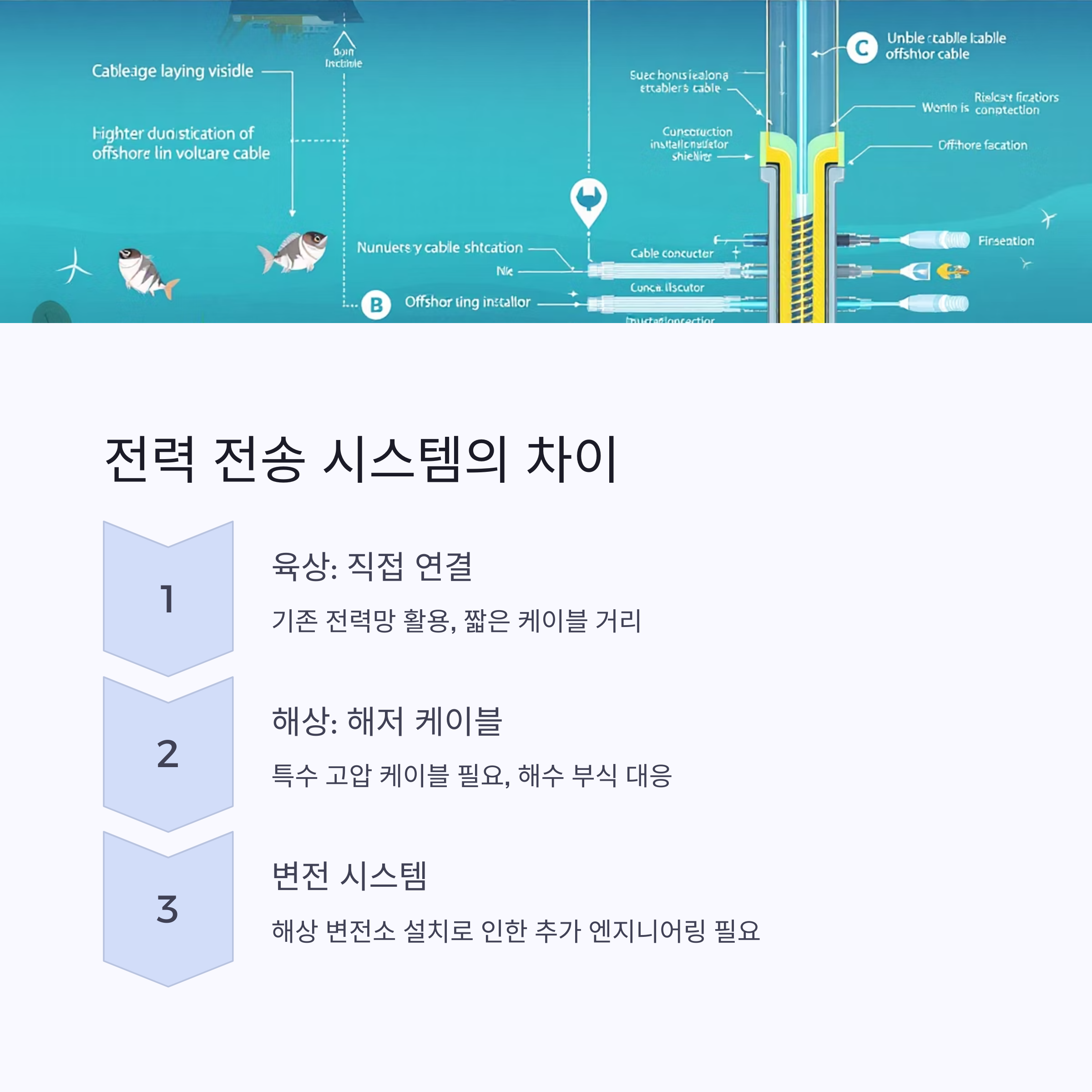 | 주요 기술적 고려사항 | 소음, 경관, 운송 제약, 지반 안정성 | 부식, 염해, 태풍, 파랑하중, 접근성 |