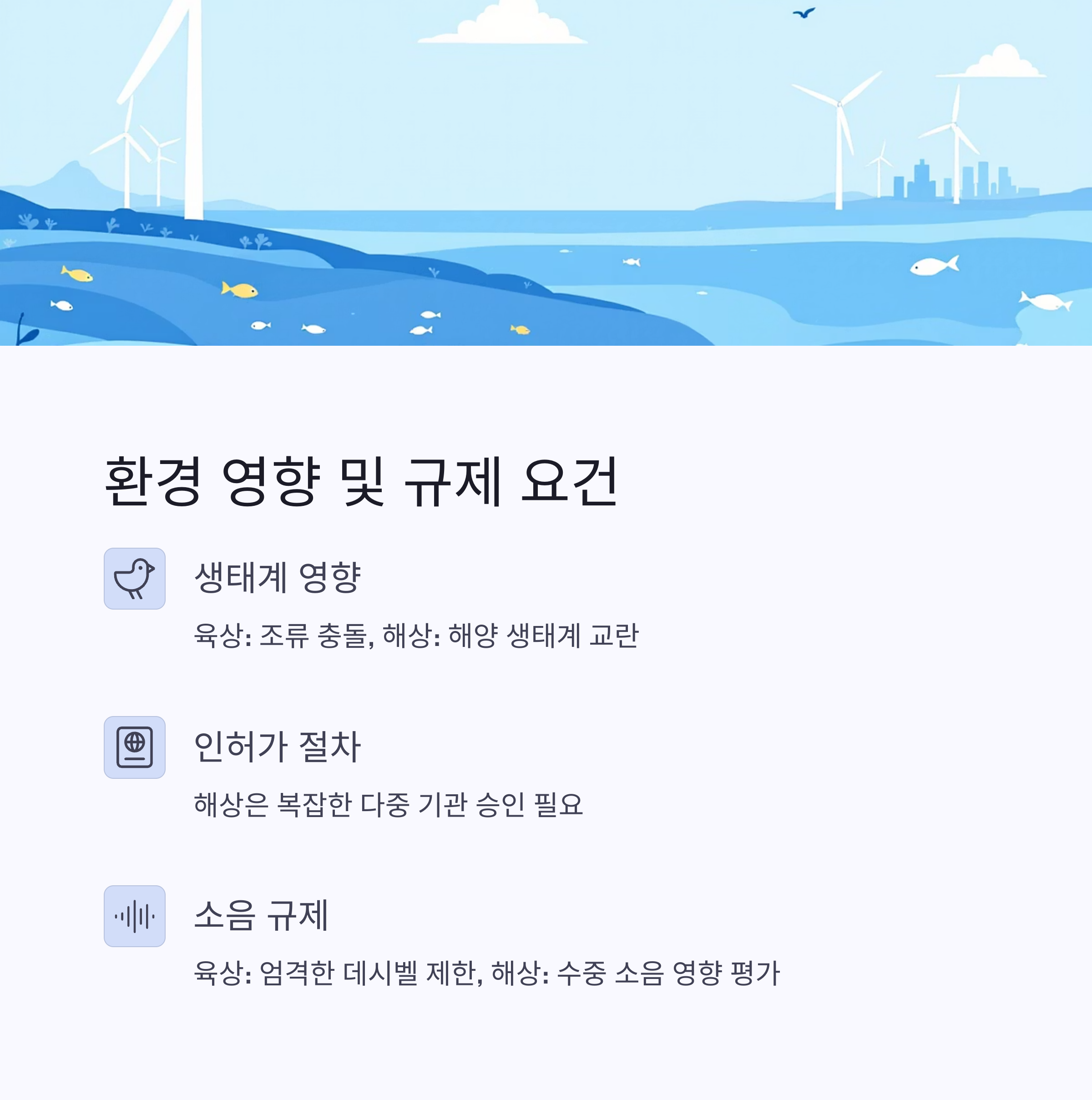 | 주요 환경 이슈 | 소음/저주파, 조류 충돌, 경관 훼손, 그림자 깜빡임 | 해양생태계 교란, 수중 소음, 어업 활동 영향, 항로 간섭 |