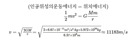 지구를 탈출하기 위해 필요한 속도는 에너지 보존 법칩으로 계산할 수 있다. 인공위성의 운동에너지가 모두 위치에너지로 변환된다고 가정하고 계산할 수 있으며, 그 결과는 약 11.2km/s 이다.