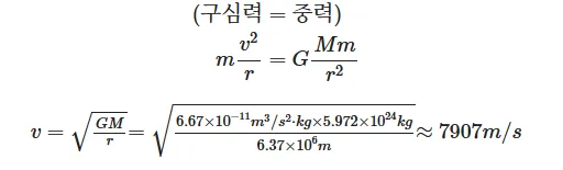 원 궤도를 유지하지 위한 속도는 구심력과 중력의 평형으로 예측할 수 있다. 그 결과는 약 7.9km/s이다.