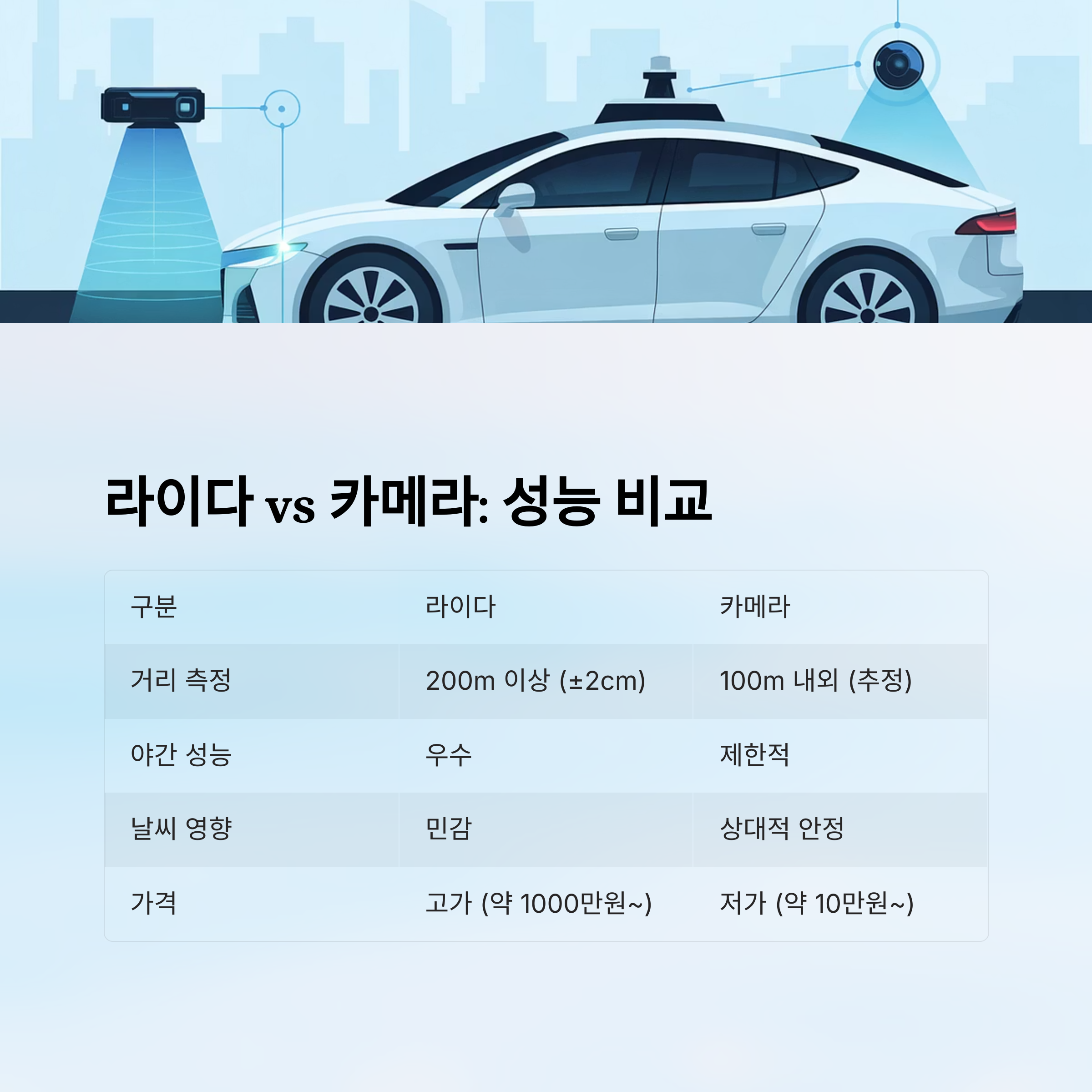 라이다는 레이저 빔을 수백만 개 발사해 주변 환경의 정확한 3D 맵을 그려내요. 밤이든 낮이든 똑같은 성능을 발휘하고, 물체까지의 거리를 센티미터 단위로 정확하게 측정할 수 있죠. 근데 이런 고성능에는 그만한 대가가 따릅니다.