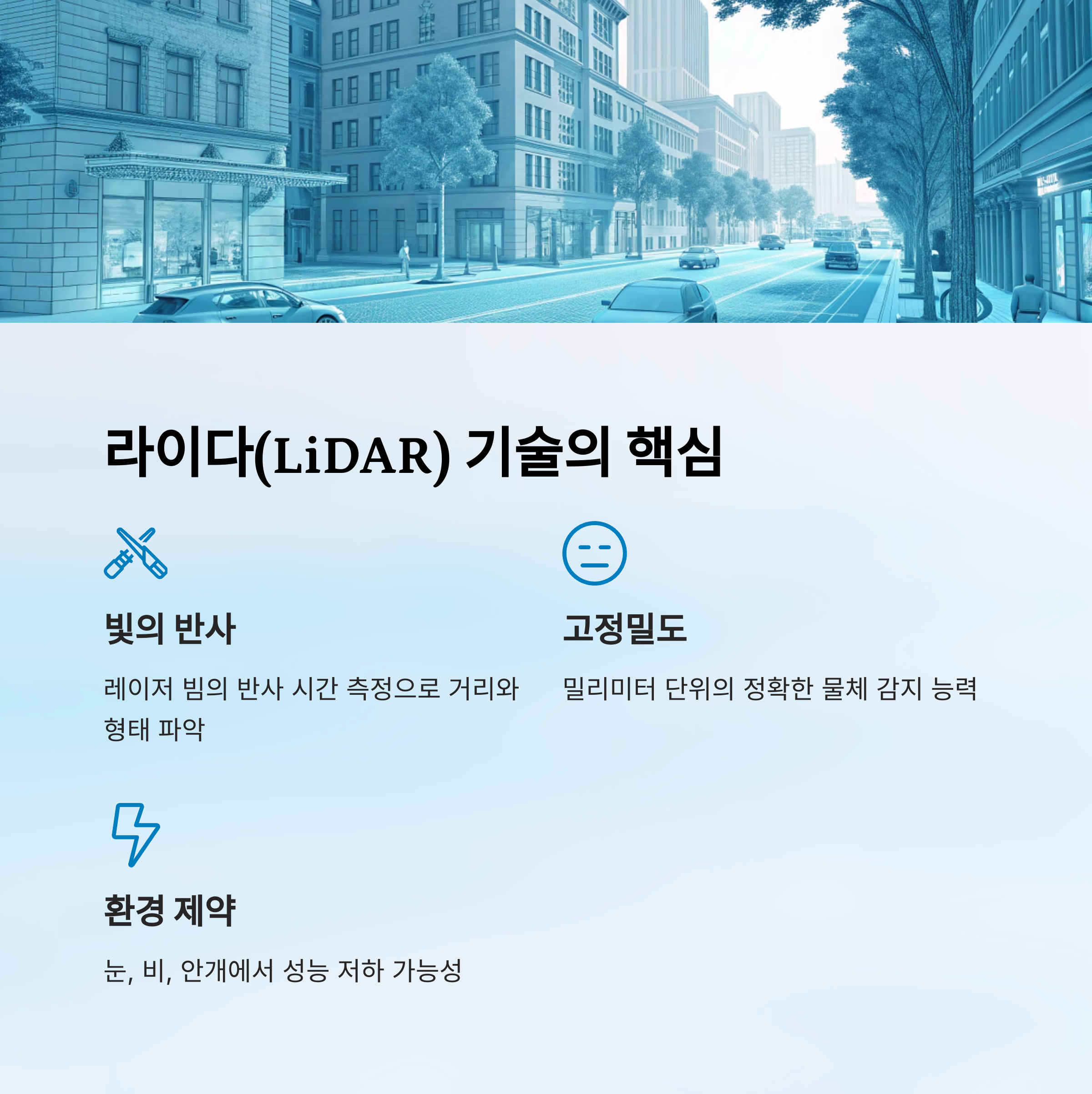 라이다는 레이저 빔을 수백만 개 발사해 주변 환경의 정확한 3D 맵을 그려내요. 밤이든 낮이든 똑같은 성능을 발휘하고, 물체까지의 거리를 센티미터 단위로 정확하게 측정할 수 있죠. 근데 이런 고성능에는 그만한 대가가 따릅니다.