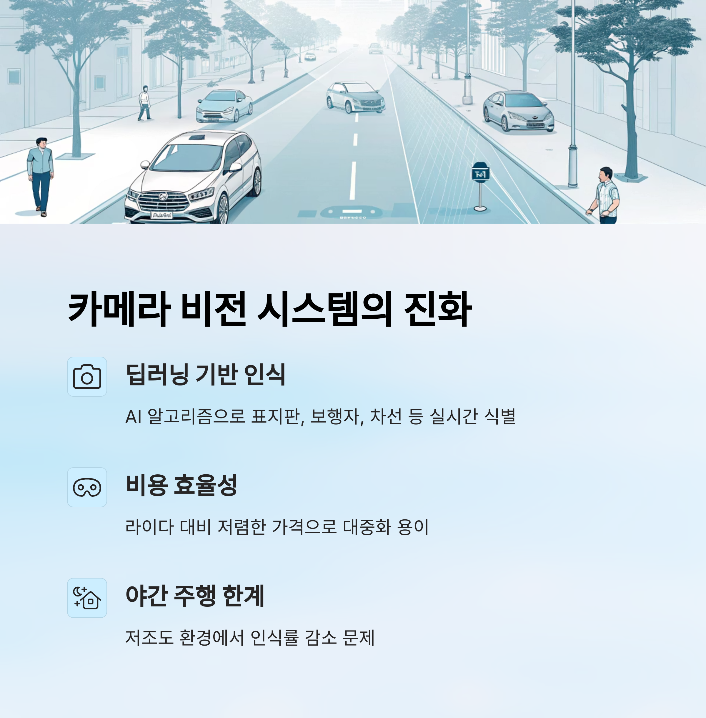 흥미로운 건 자율주행 업계가 두 진영으로 나뉘었다는 거에요. 테슬라는 카메라 비전 전용 접근법을, 웨이모와 많은 전통 자동차 제조사들은 라이다를 포함한 다중 센서 접근법을 택했죠. 이 경쟁은 결국 어떤 기술이 더 빨리 안전한 완전자율주행을 실현하느냐로 결론날 것 같아요.
