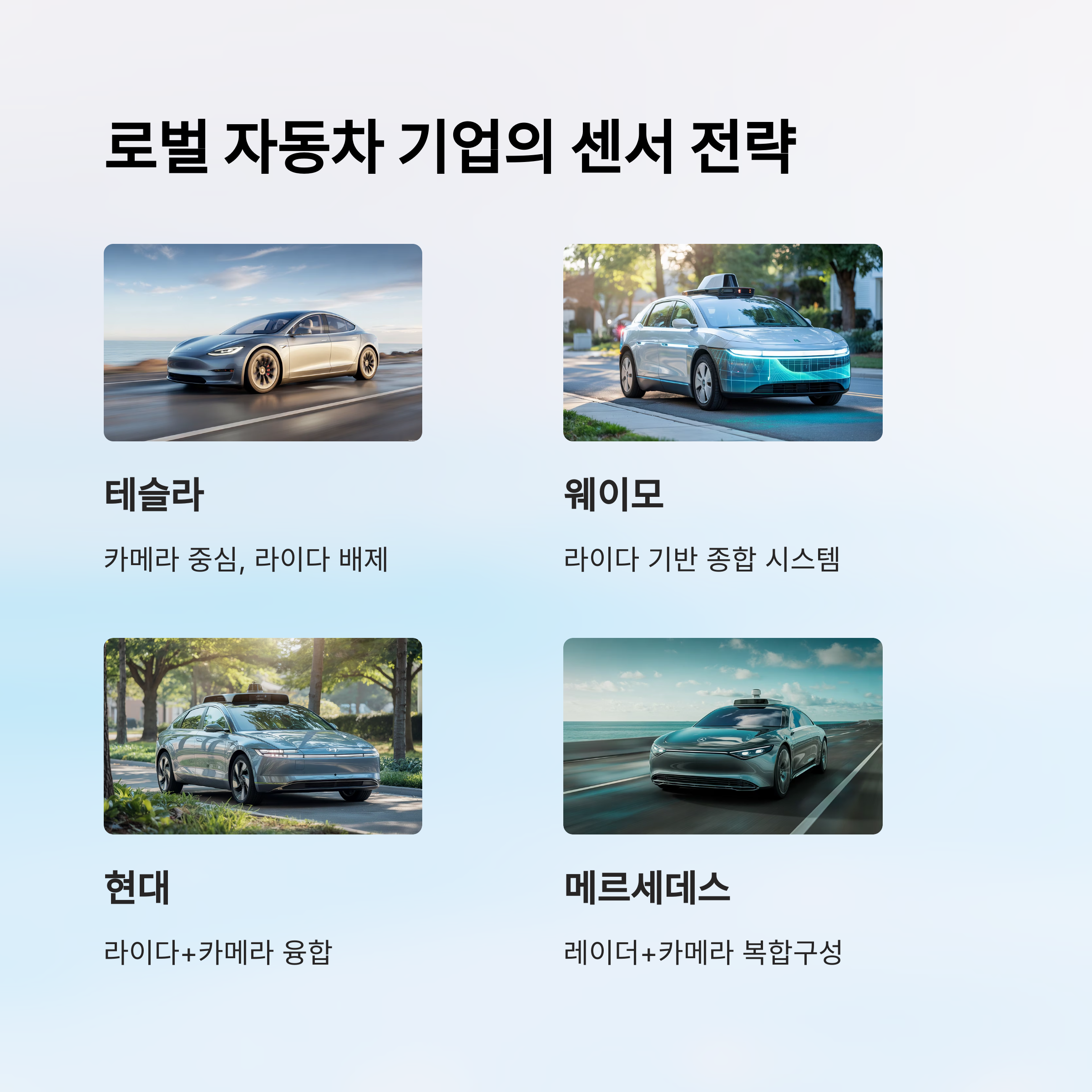 | 기업 | 주요 센서 구성 | 전략적 특징 | 자율주행 접근법 |