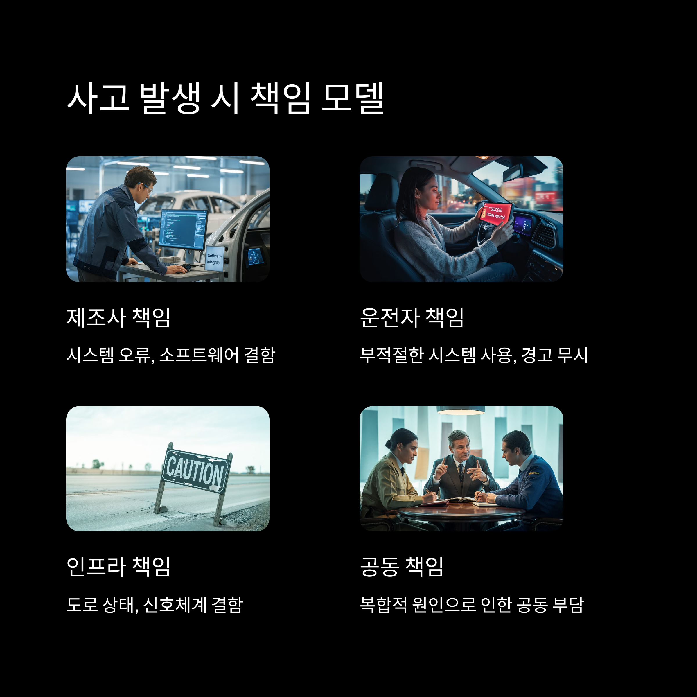 - 혼합 책임 모델: 상황에 따라 운전자와 제조사가 공동으로 책임을 지는 모델입니다. 독일은 이런 접근 방식을 채택했는데, 시스템 오작동으로 인한 사고는 제조사가, 운전자의 부주의로 인한 사고는 운전자가 책임을 집니다. 물론 이 경계를 정확히 구분하는 것도 어려운 문제죠.