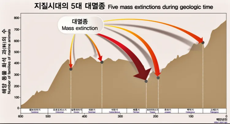 | 페름기 말 | 대규모 화산 활동, 운석 충돌 | 해양 생물 96%, 육상 생물 70% 이상 | 지구 역사상 최대 규모 |