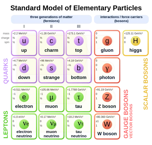 소립자는 크게 페르미온(Fermion)과 보손(Boson)이 있다. 입자가 가지는 내재된 각운동량을 스핀이라고 하는데 스핀이 정수이면 보손이고 정수가 아니면 페르미온이다. 페르미손은 파울리 배타원리(같은 양자 상태에서는 두 개의 동일한 페르미온이 존재하지 못한다)로 인해 같은 양자상태를 가질 수 없지만, 보손은 같은 양자 상태를 가질 수 있다. 즉 보손은 집단행동을 할 수 있다. 현재 알려진 페르미온 입자로는 쿼크(Quarks)와 랩톤(Leptons)이 있다. 보손은 포톤(Photon), 힉스입자(Higgs), 글루온(Gluon)등이 있다. (아래의 표준 입자 모형 참조)