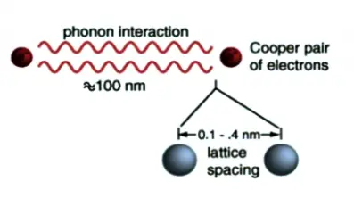 포논은 위의 그림에서 원자핵의 격자를 의미한다고 생각하면 된다. 이때, 상대적으로 원자핵에 비해 수천배나 가벼운 전자가 포논 속으로 빠르게 지나가게 되는 경우를 상상해 보자. 전자와 원자핵은 서로 부호가 반대이기 때문에 원자핵을 끌어당긴다. 이 때 전자는 빠르게 지나가 버리고 상대적으로 질량이 큰 원자핵은 느리게 회복되는데, 이때 뒤에 따라오는 전자는 모여진 원자핵으로 인해 인력(끌어당기는 힘)을 느끼게 된다. 이 힘이 초전도 물질에서는 척력에 비해 훨씬 크기 때문에 전자는 쿠퍼 쌍(Cooper pair)을 이루며 저항 없이 이동할 수 있게 된다.