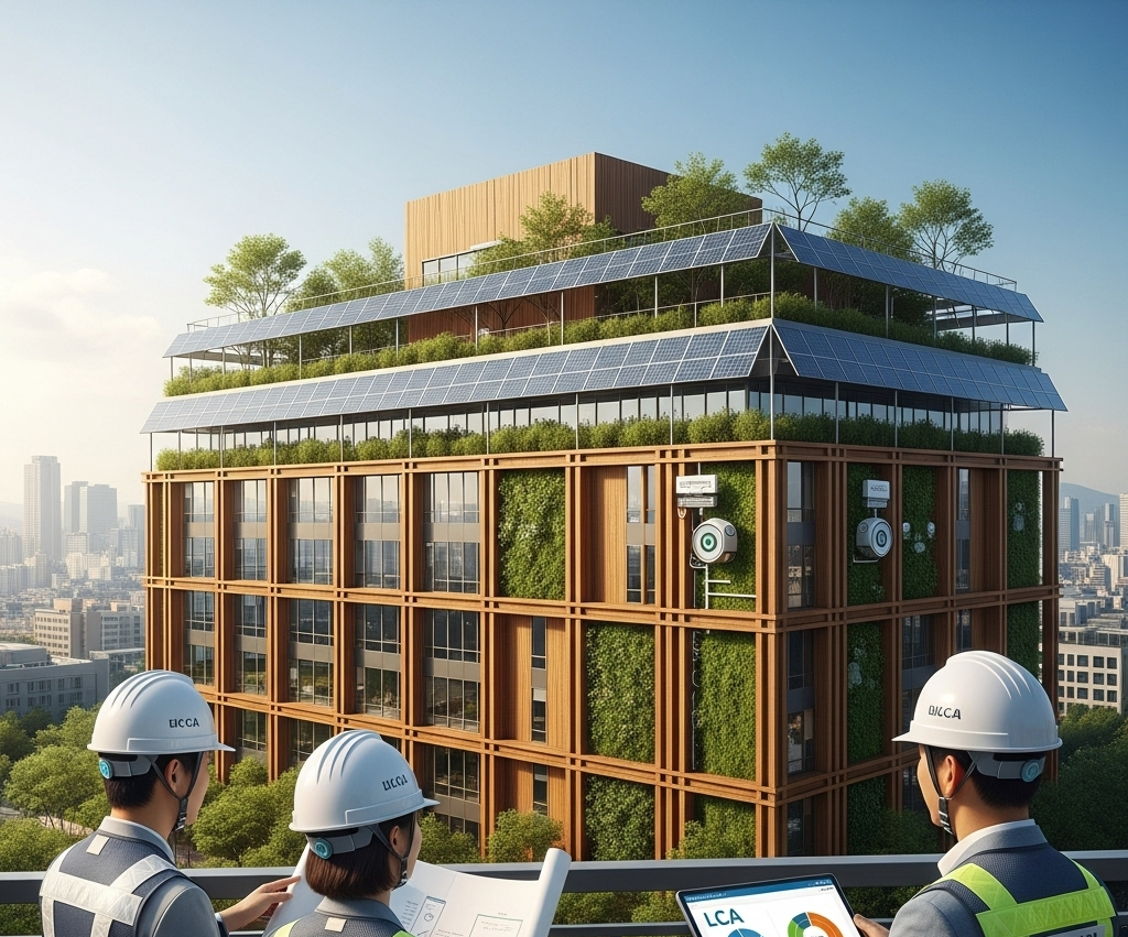 초기 설계 단계에서 LCA(전생애주기평가)를 수행하고, 목재 사용, 녹지 조성, 탄소 흡수형 건축자재 도입을 종합적으로 고려하세요. 작은 설계 변경이 장기적으로 큰 탄소 감축을 만들어냅니다.