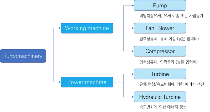 터보기계는 유체기계의 한 종류로써 회전하는 기계를 통칭하는 말이다. 터보기계는 로터(Rotor)와 유체 사이에서 에너지를 전달하는 기계를 의미하며 크게 Work machine과 Power machine으로 나뉘어 진다.