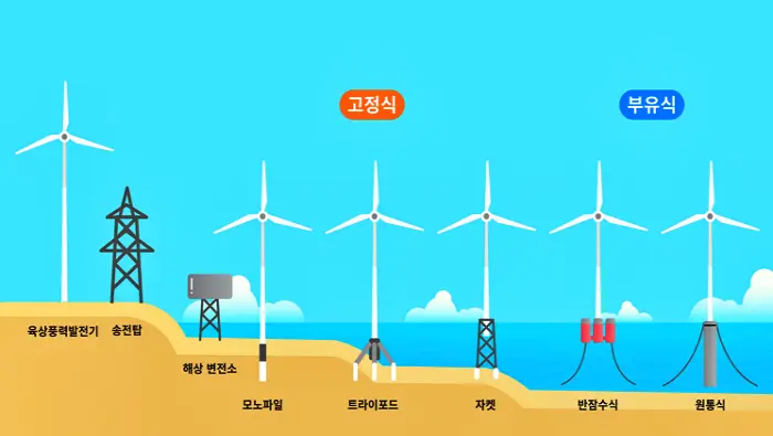 풍력 발전기가 육상에 설치될 경우 육상 풍력 발전기, 해상에 설치될 경우 해상 풍력 발전기라 분류하며, 설치 형식에 따라 땅에 고정되어 있는 고정식과 물에 떠있는 부유식으로 분류됩니다.