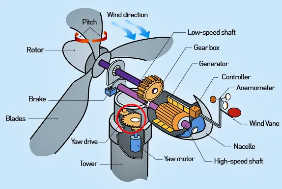 - 피칭 시스템: 블레이드의 경사각을 조절하여 출력을 제어하는 장치입니다. 요잉 시스템: 로터의 방향을 바람 방향으로 조절하는 장치입니다.