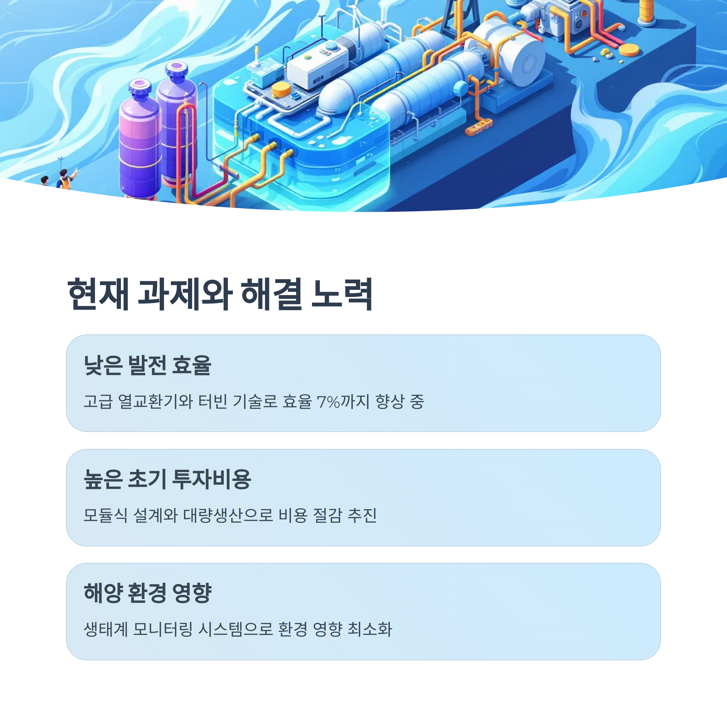 높은 초기 투자 비용 | 해양 구조물, 심층수 취수관 건설 등 | 모듈형 설계, 부유식 플랫폼, 신소재 개발을 통한 비용 절감 |