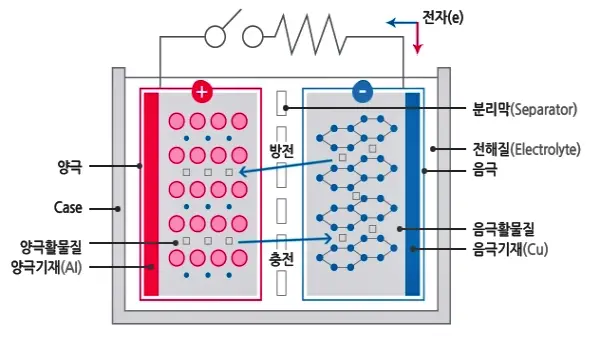 2차 전지는 전기 화학적인 산화-환원 반응을 이용하여 전기를 생산하고 저장하는 장치이다. 양극의 이온이 음극으로 이동하면 배터리가 충전된다. 반면에 음극의 리튬이온이 양극으로 이동하면 방전되며 에너지를 방출한다. 이때 양극과 음극 사이에 이온의 이동 통로 역할을 해주는 전해질이 존재한다. 그리고 전해질과 양극과 음극의 직접적인 접촉을 막는 분리막으로 구성되어 있다.