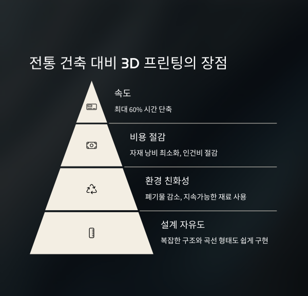 - 시간 효율성: 3D 프린팅 건축은 전통적인 건축 방식에 비해 최대 70% 빠르게 건물을 완성할 수 있어요. ICON의 경우 기본 구조물을 단 24시간 만에 완성했고, 두바이의 '오피스 오브 더 퓨처'는 17일 만에 출력을 완료했어요. 전통 건축이었다면 최소 6개월은 걸렸을 거예요.