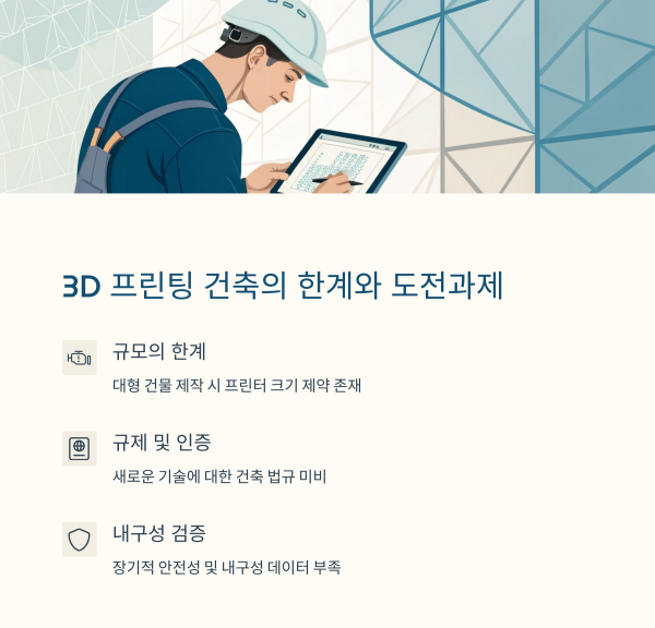 지금까지 3D 프린팅 건축의 장점만 이야기했는데, 솔직히 말해서 아직 완벽한 기술은 아니에요. 여러 한계와 해결해야 할 과제들이 남아있죠. 마치 모든 신기술이 그렇듯이요. 제가 건축 전문가들과 대화하면서 알게 된 주요 도전과제들을 정리해봤어요.